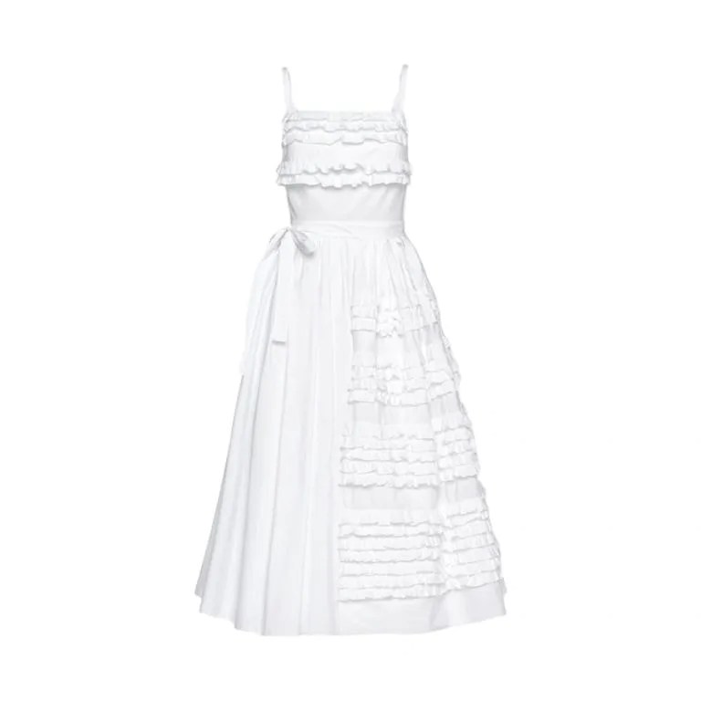 Per un tocco sottile frou frou, opta per questo abito in popeline di cotone che viene fornito con mini volant a strati sulla gonna intera.