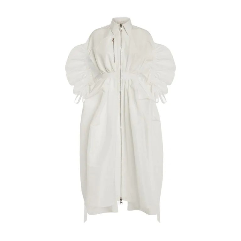 Sarah Burton si è ispirata alle soffici nuvole di tempesta per il design di questo abito da camicia che vanta una drammatica gonna con paracadute e maniche a bozzolo.