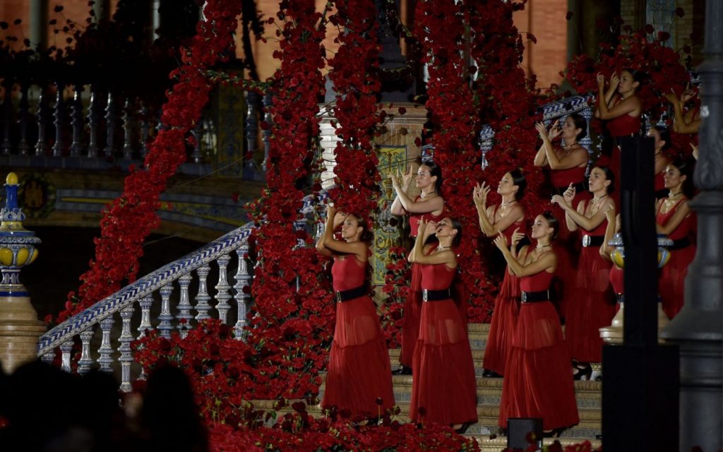 The whole show is accompanied by flamenco notes played by a live orchestra complete with violins. The choreography is impressive and the dancers are dressed in scarlet dresses, transparent tulle leotards from Dior.
