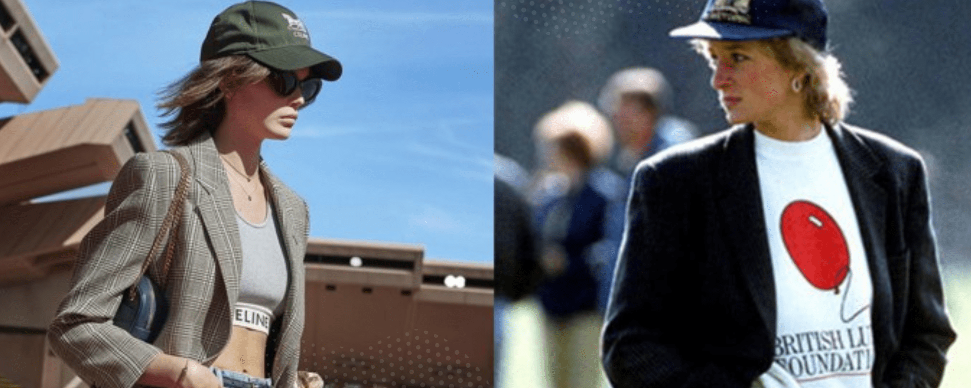 Second only to the very famous revenge dress (wored when Prince Charles’ betrayal was made official), this look is one of the most viral on the web. Maybe because it was not usual to see a princess on a casual outfit. Or maybe because of its incredible relevance. Straight jeans, baseball hat and oversized blazer. Celine’s look is (blatantly) a copy of the real one. The only difference is in the top. If for this summer the catwalks recommend it cropped, Lady D was a comfortable sweatshirt, with a baggy fit.