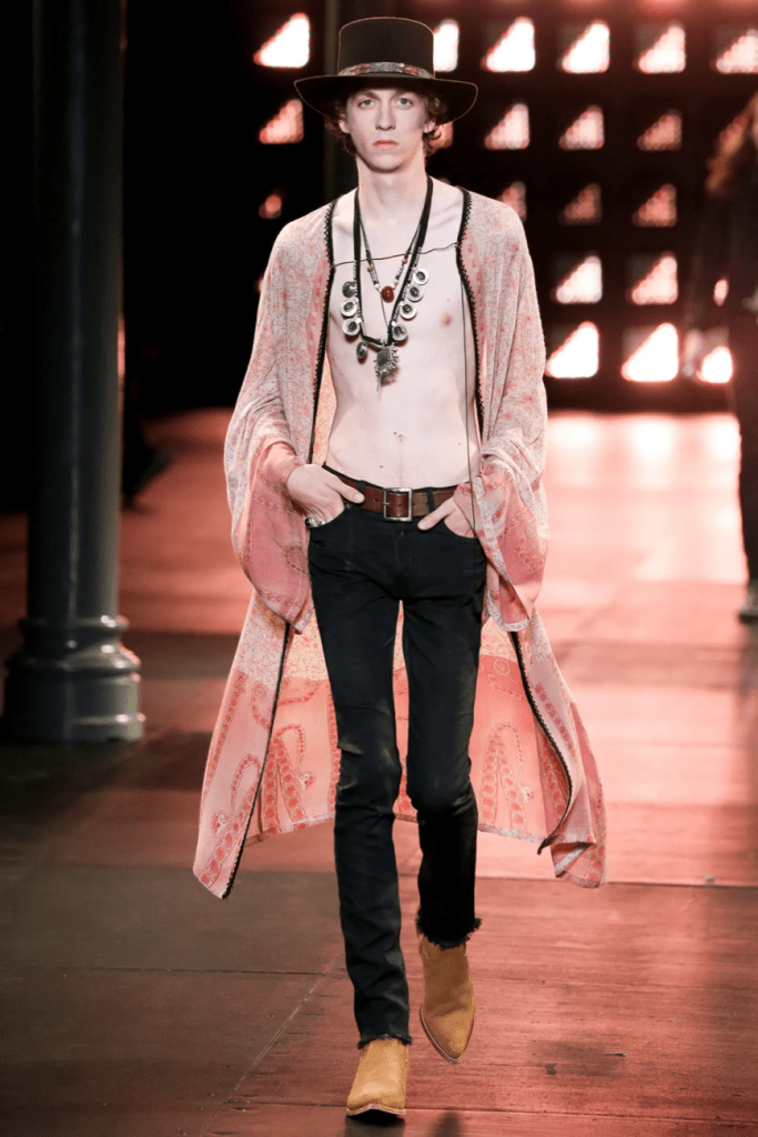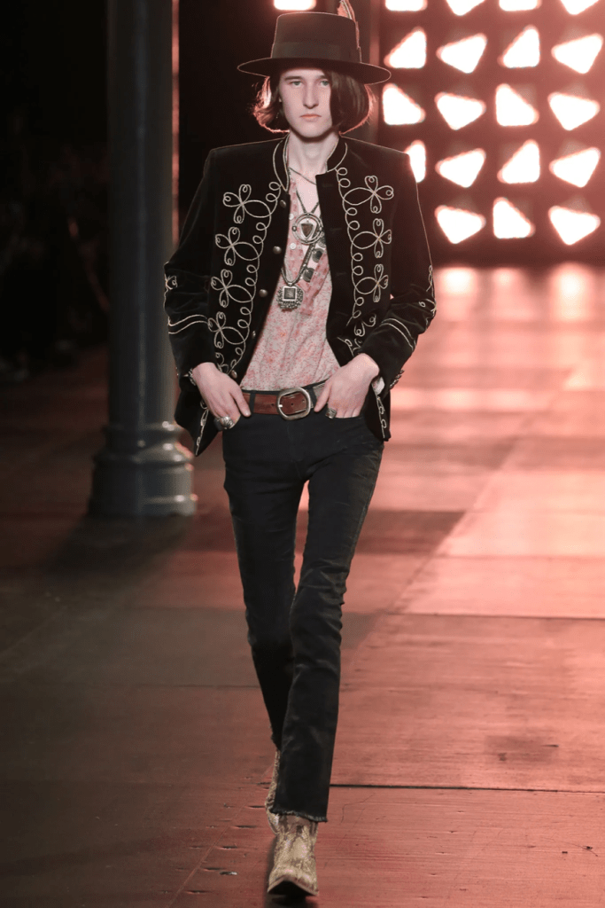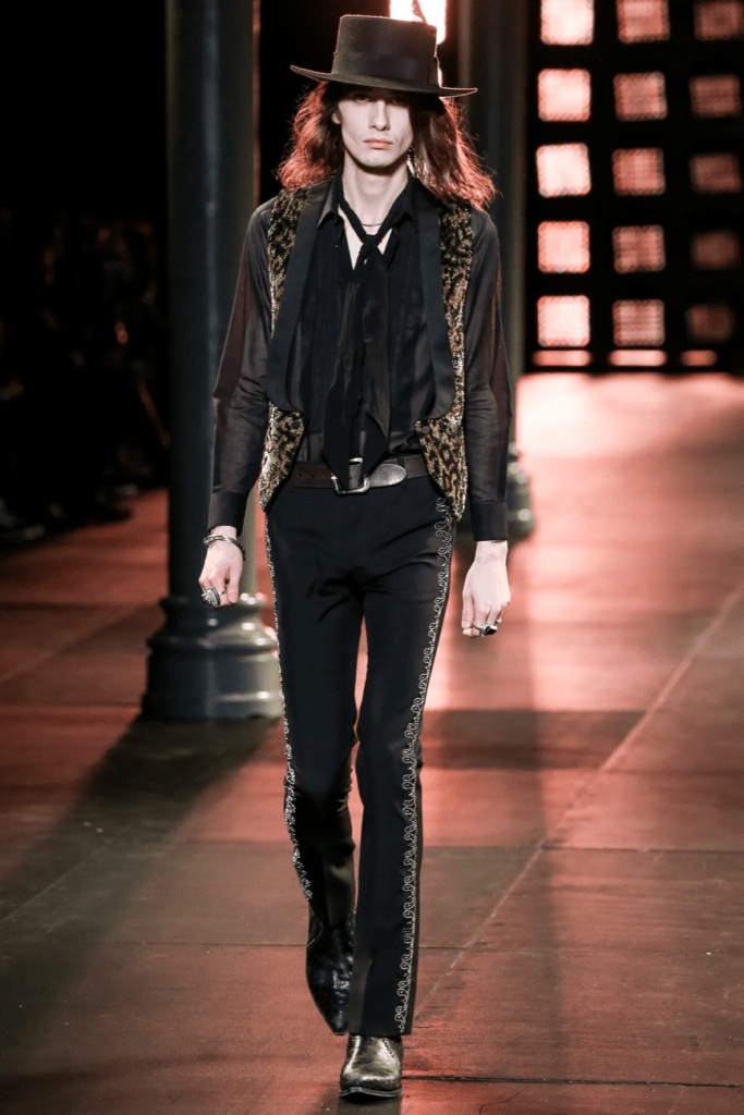 The codes of western aesthetics have been permanently grafted into the language of contemporary menswear by Slimane’s revolutionary stylistic work, which exported it from its original American fashion culture and romanticized the connections it had with surfing, rock, and in general with that reinvented imagery of masculinity typical of the work that Slimane performs.The Wyatt boot, for instance, had the advantage of fusing western culture with mod and rock ideas by taking the sole and heel of cowboy boots and grafting them onto the traditional English Chelsea Boot. Slimane thus succeeded in persuading hundreds of thousands of men to wear heels without even realizing it. Three of Slimane’s most iconic collections stand out at Saint Laurent’s SS15, with leathers, amulets, and fine fabrics that elevate the cowboy style to an unattainable concept of luxury. The cowboy boot that Slimane redesigned for Celine, the model of which is named Jacno, was present at Celine’s final Paris fashion show.