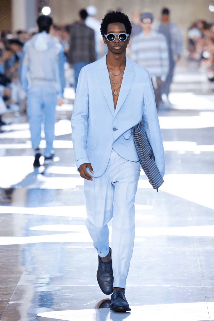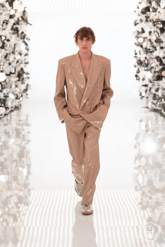 And, long before the catwalks showed off their expressive potential—to cite just a few—Maison Margiela SS16, Dries Van Noten SS17, Alexander McQueen AW18, and Zegna SS19—it was typical to see rock or punk vocalists donning a shirtless outfit, frequently baring their torso. Subcultures have grown in strength and new ones have emerged in the meantime; it is no accident that soft boys have started to dress in pastel hues, jewelry, and shirtless jackets. Timothée Chalamet was one of them and he appeared at the most recent Oscars without a shirt and a sparkling women’s jacket from Louis Vuitton. Kim Jones started the process when he was appointed creative director of Dior Home in 2018. His deconstruction of menswear used the folds of a form without any obvious gender cues and a limited color palette. Silvia Venturini of Fendi performed on the same waveline and had already reinterpreted the male wardrobe with the SS22 show in the form of a cropped jacket without a shirt.Because of this, the question is extremely unstable: while menswear continues to suggest and produce blazers in the strictest sense of the word, as evidenced by the first looks from Prada’s SS23 show, it is also experimenting with forms of design and styling that subvert the sense of security provided by the formal.With his most recent show, Thom Browne staged a blazer teamed with a resemblance of a tweed bra, breaking his relationship with safety. As with the jockstrap-wearing models, there is actually very little subversion here; rather, the act of challenging formal attire in all of its elements is the outpost of a narrative conflict that will continue to drive catwalks, fashion, and society.