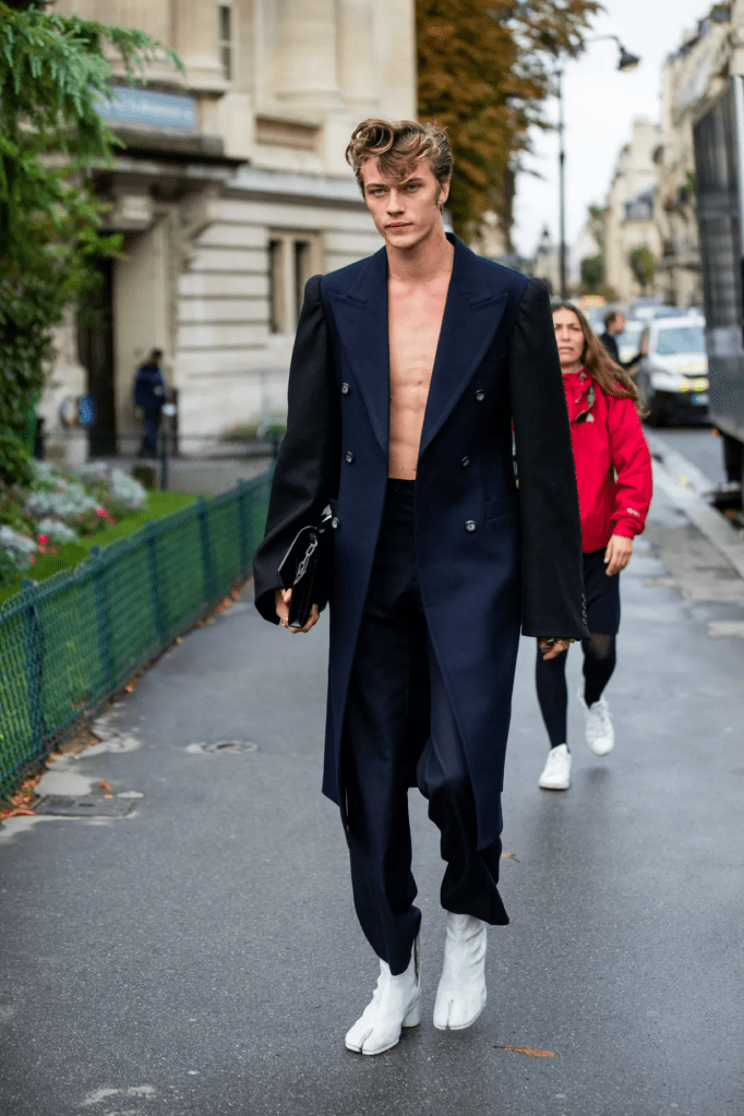 Lately a lot of modern menswear gives off the impression of being sexy, immediate, and as little covered as possible. Menswear has also started to pare down the unnecessary, of blouses and tops as seen in a post of Miu Miu womenswear (the SS22 collection is undoubted la the most relevant in terms of aims and trends). By Removing the shirts that were worn under a formal blazer, the tight shape and buttons, and everything else that was left over from unresolved conflicts, such as ties, knots, and belts , symbolically speaking, served to confine a particular conception of masculinity.