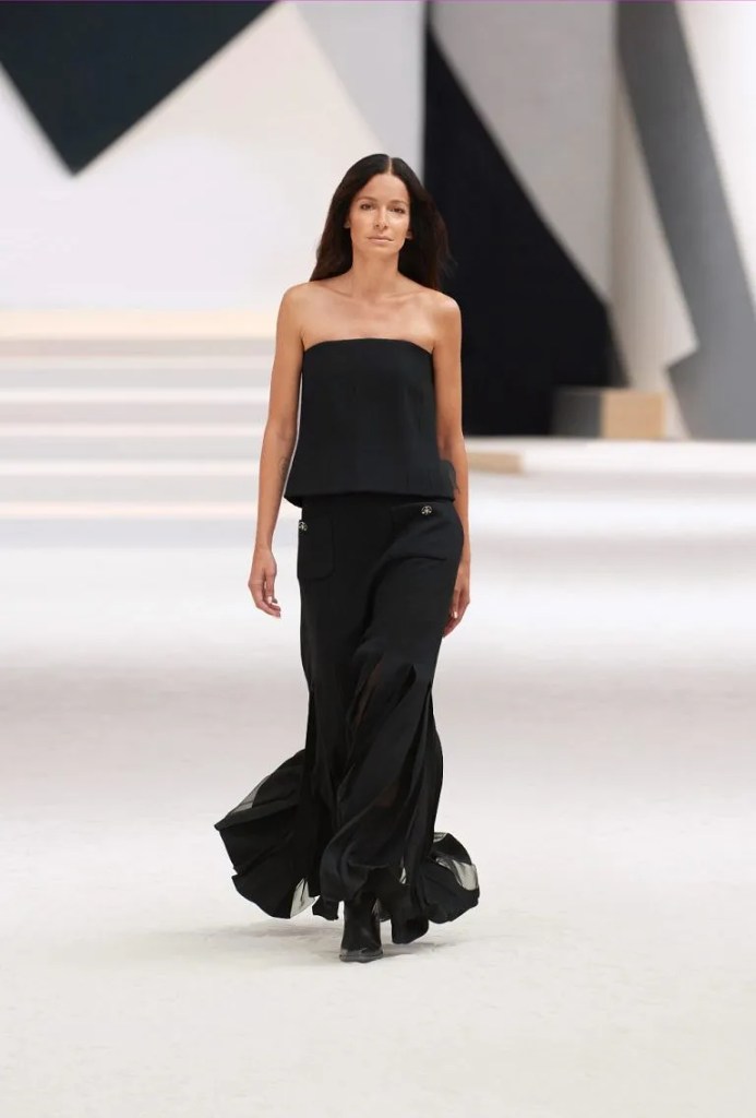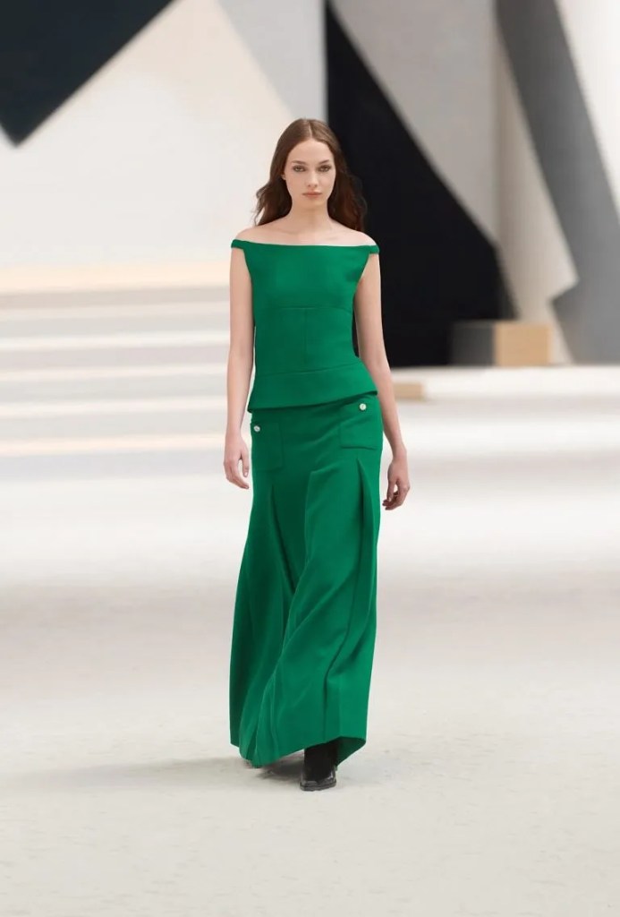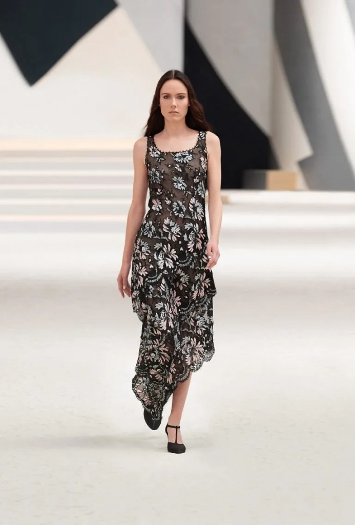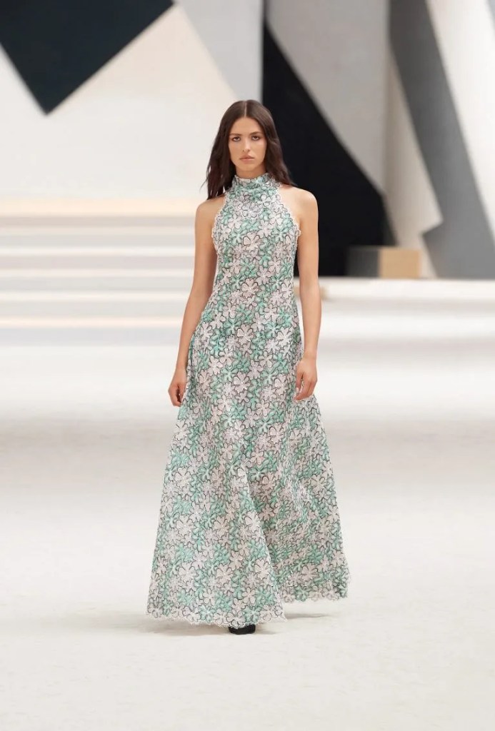 I modelli scivolano in pantaloni slinky e abiti a pieghe sul pavimento, impreziositi da intricati lavori di pizzo intarsiati e perline con motivi geometrici. Il risultato? Capi che sono ridotti e rilassati, che ricordano lo stile personale di Mademoiselle Chanel – “leggero, femminile, progettato per essere indossato”, come descritto da Viard.