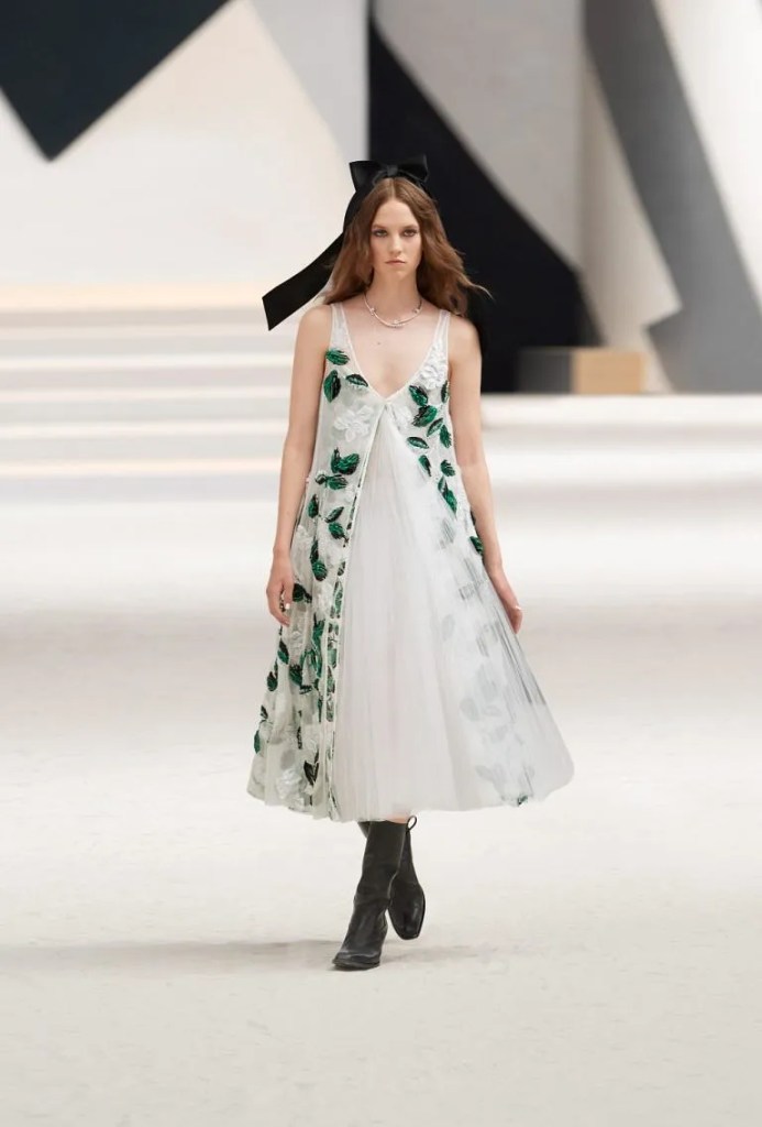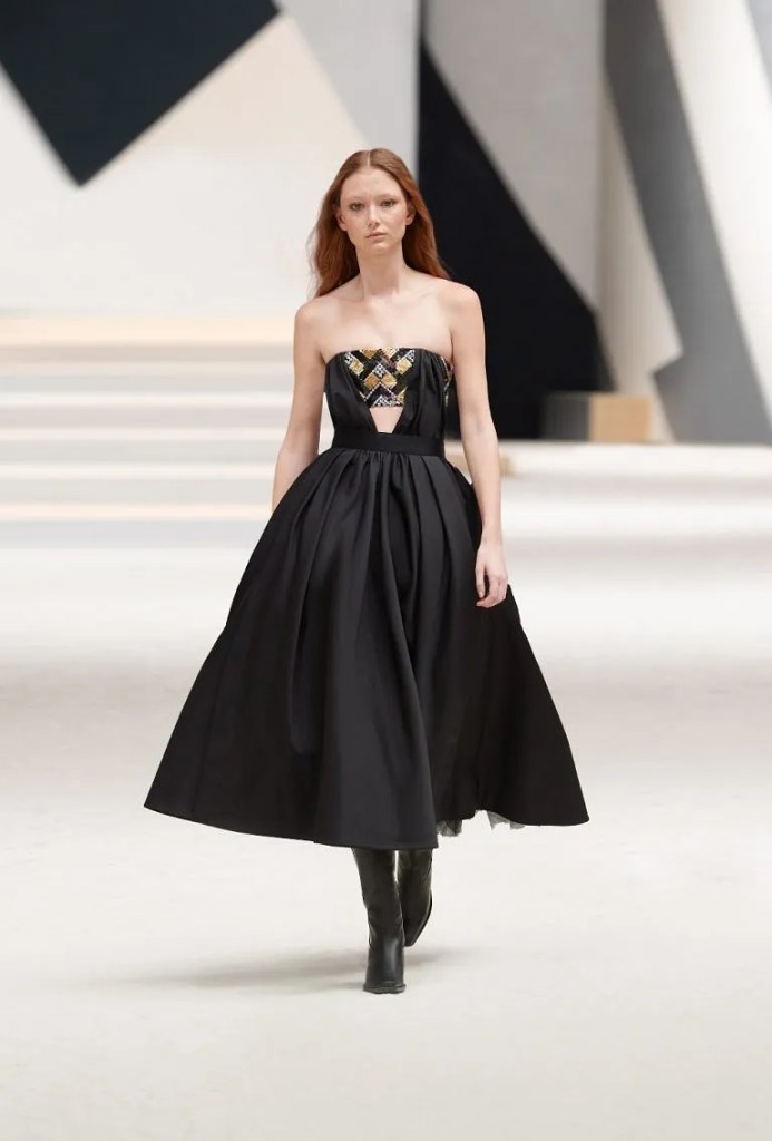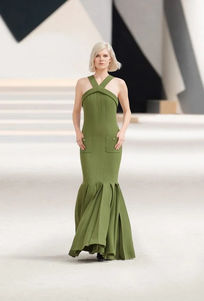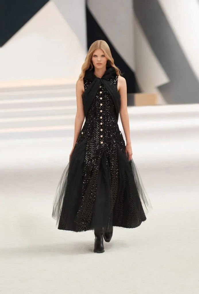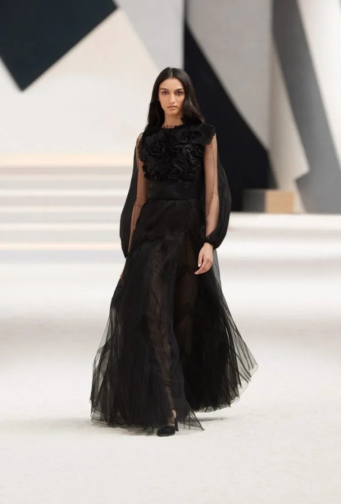 I modelli scivolano in pantaloni slinky e abiti a pieghe sul pavimento, impreziositi da intricati lavori di pizzo intarsiati e perline con motivi geometrici. Il risultato? Capi che sono ridotti e rilassati, che ricordano lo stile personale di Mademoiselle Chanel – “leggero, femminile, progettato per essere indossato”, come descritto da Viard.