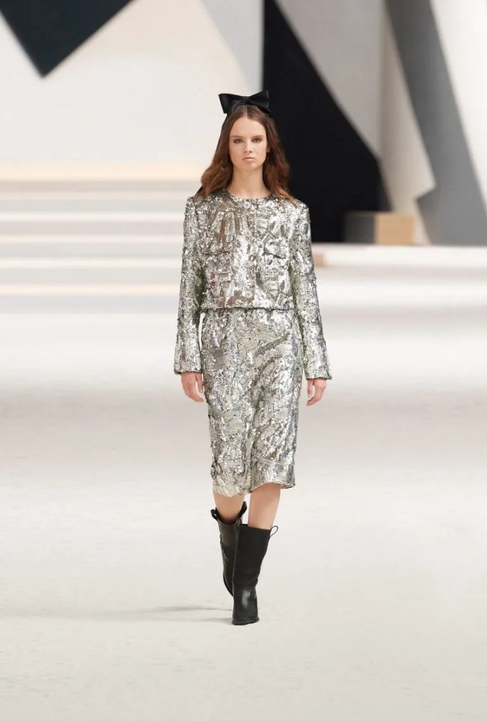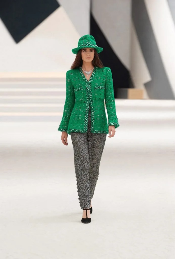 Anche gli stivali da cowboy e i cappelli oversize, resi in tweed, fanno la loro comparsa in passerella. “Questi stivali riecheggiano anche la precedente sfilata di alta moda che si è aperta con Charlotte Casiraghi a cavallo”, dice Viard.