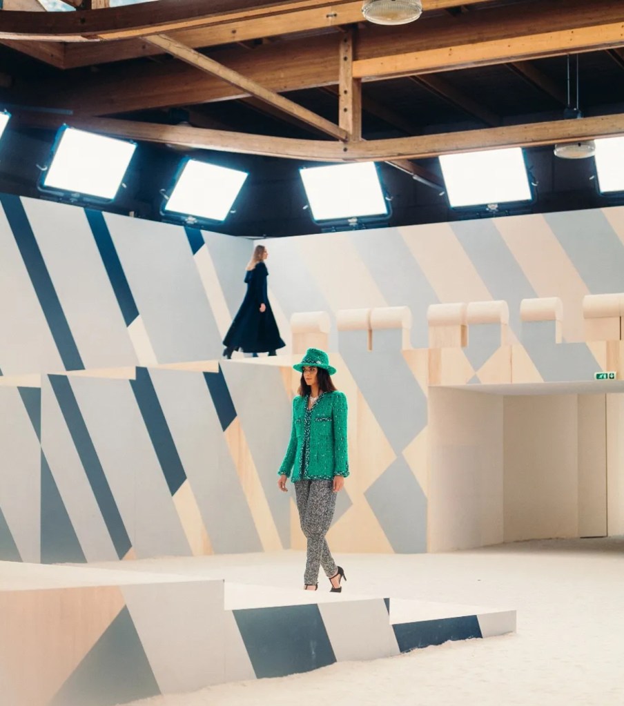Per questa collezione, l’artista Xavier Veilhan – che ha anche progettato il set per la sfilata haute couture Primavera/Estate 2022 di Chanel – ha creato un labirinto di sculture che hanno ricordato blocchi di giocattoli ma hanno fatto saltare in aria proporzioni monumentali, simile a un’esposizione a grandezza naturale di un ambiente di videogiochi dei primi anni 2000.I video teaser presentano sovrapposizioni intenzionalmente imperfette dello schermo verde delle muse della casa Charlotte Casiraghi e Vivienne Rohner su sfondi glitchy, prefigurando l’approccio della sede dello spettacolo di intersecare il virtuale e il reale.