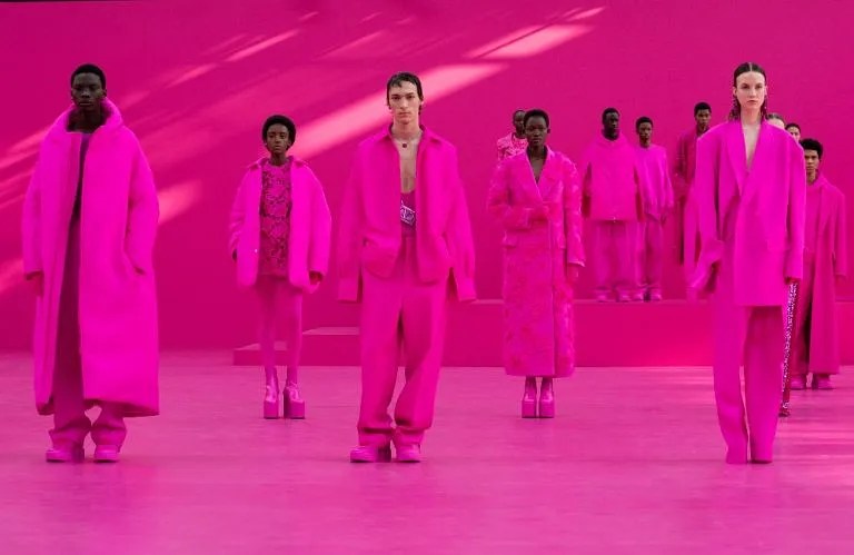 Il direttore creativo Pierpaolo Piccioli ha presentato un concetto così radicale e sorprendente nella sua semplicità: una collezione di 81 look quasi interamente in un’unica, sconvolgente tonalità di rosa – creata in collaborazione con il Pantone Color Institute – svelata su un ampio set della stessa tonalità. Saturando tutto dello stesso colore (hardware incluso), ha voluto attirare l’attenzione sulle diverse sagome e dettagli di un guardaroba che avrebbe trasceso le esigenze e le occasioni quotidiane: sensuali scollature a forma di S; vita stretta; piattaforme torreggianti; e fiocchi, pizzi e balze per abbellimento. Chi ha detto che non può esserci individualità nella monotonia?