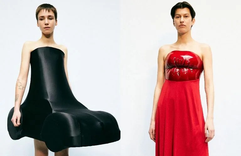 Descritta nelle note della mostra come “un’esplorazione primitiva di texture, movimento e proporzioni”, la collezione Autunno Inverno 2022 del marchio vede JW Anderson andare avanti un’altra piegata e surrealista giddibilmente giocosa. Tra i punti salienti: separatori di puffer iper-gonfiato; mini abiti in pelle con orli modellati a forma di auto; ampi abiti bustier con labbra in lattice oversize per i corpetti; e reggiseni e tacchi a palloncino (!!!). NE Basta dramma per te?