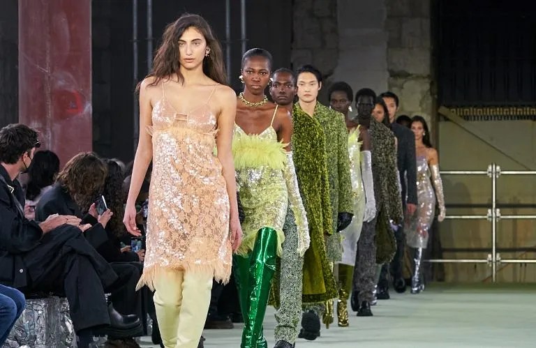 Sarah Burton ipnotizza con la magia dei funghi in una collezione ispirata al micelio – la rete di filamenti che compongono il sistema radicale e di supporto dei funghi. Abiti bustier squisitamente tagliati e pantaloni – firme della casa – sono disponibili in colori psichedelici come il verde acido e il giallo. I motivi a fungo giganti sono ricamati ad arte su maglioni nubby e abiti da festa abbagliati.
