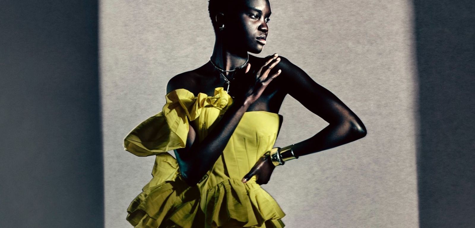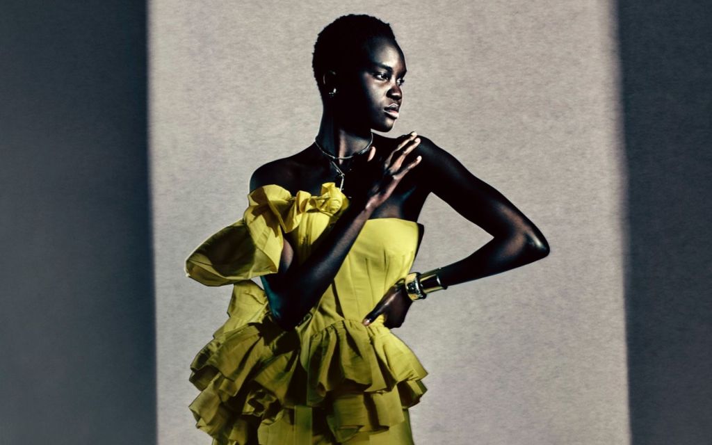 The photographs by Paolo Roversi, which feature the models Awar Odhiang, Lucia Fairfull, Florence Nicholls, Celina Ralph, Wang Han, and Achenrin Madit, range from ultra-tight tubes to leather suits without sacrificing the iconic studded accessories or bright tints. The models are all living sculptures.