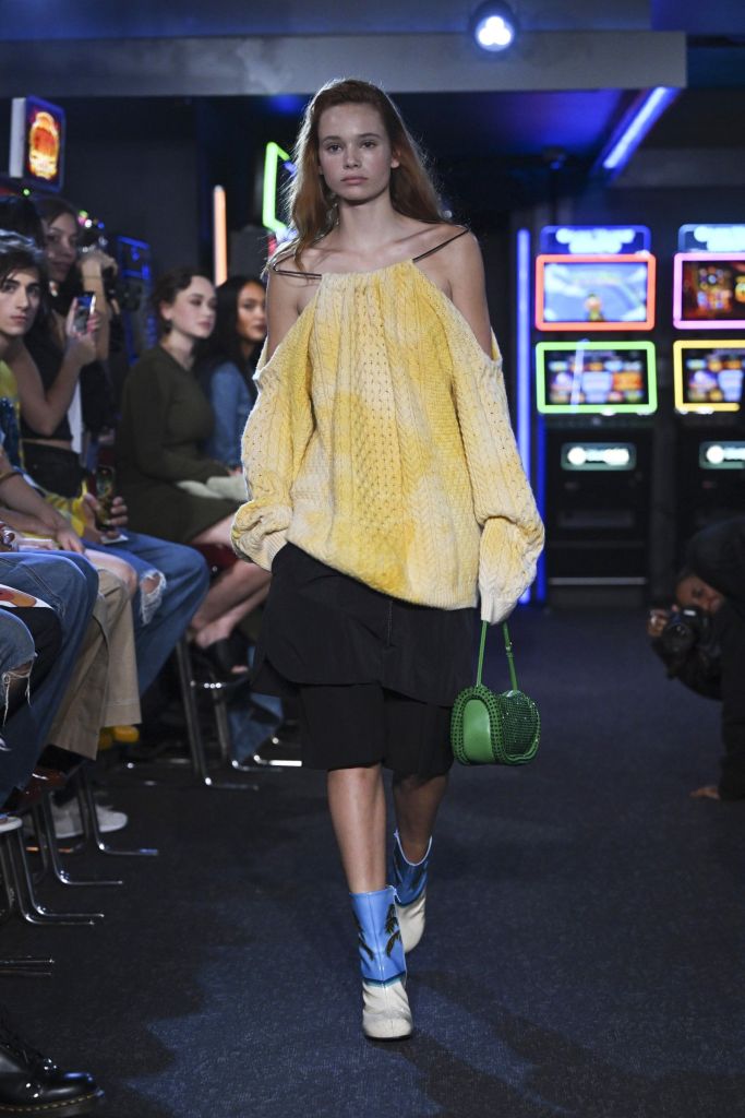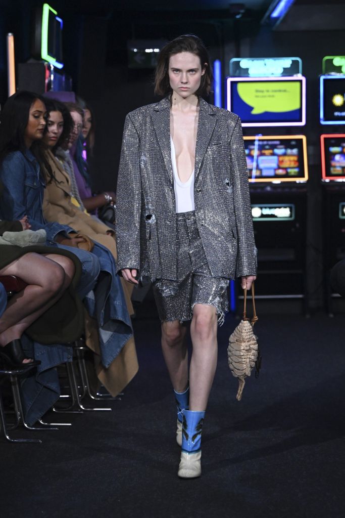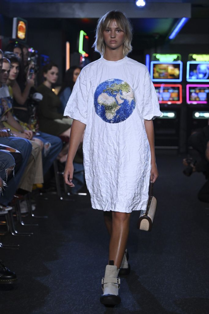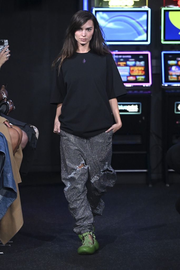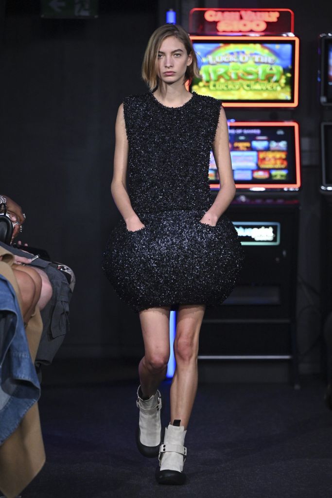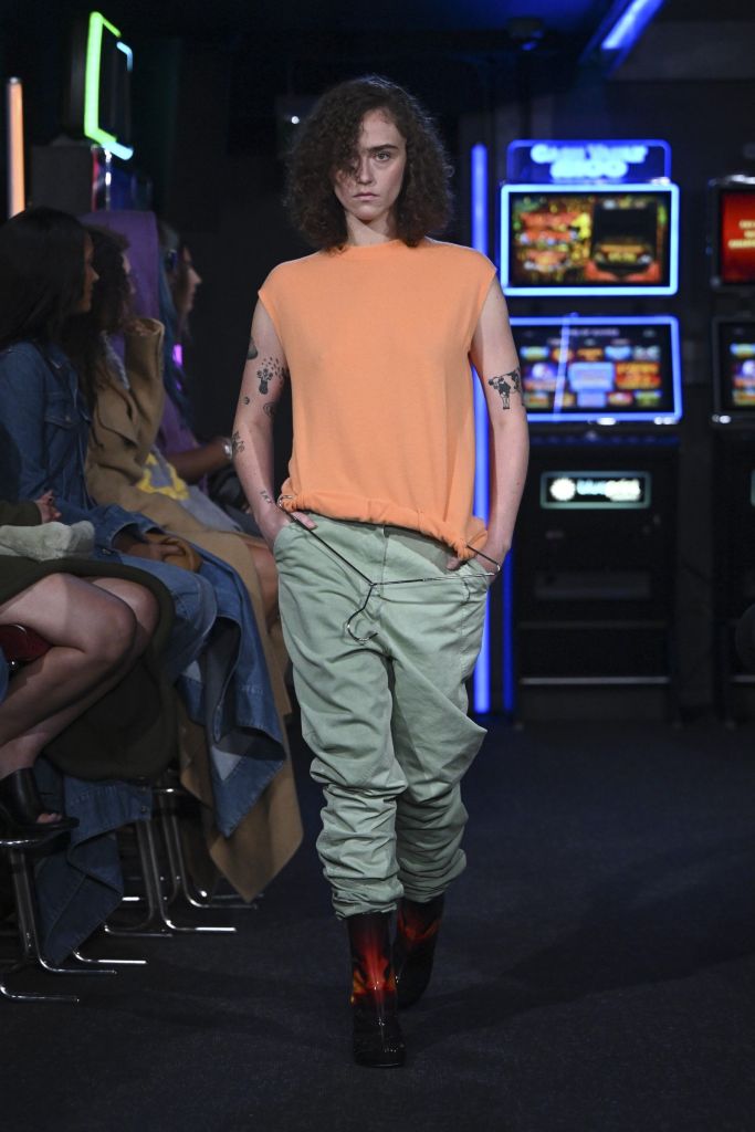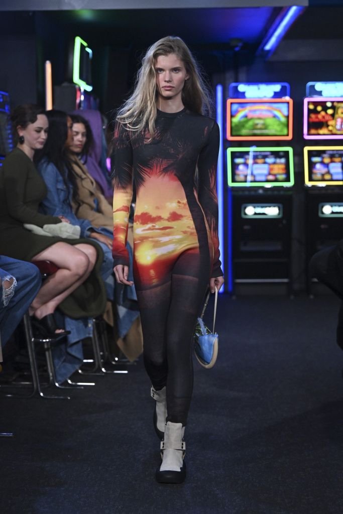 Jonathan Anderson‘s SS23 presentation, held yesterday in a vintage arcade in London, had a bizarre Alice in Wonderland feel to it. The garments and styles looked like alienating abstractions of everyday items, sarcastic reversals of a reality that continues to switch with the virtual and vice versa. In a world where the physical WORLD and metaverse interact paradoxically, amidst identity changes, and in a liminal space suspended between the two worlds that is symbolized by the arcade that becomes a metaphor for technology, the reference to our relationship with technology remained prevalent. Tops made entirely of keyboard buttons and prints from stock photos used as wallpaper speak of the “nature filtered by digital ego” in this world.