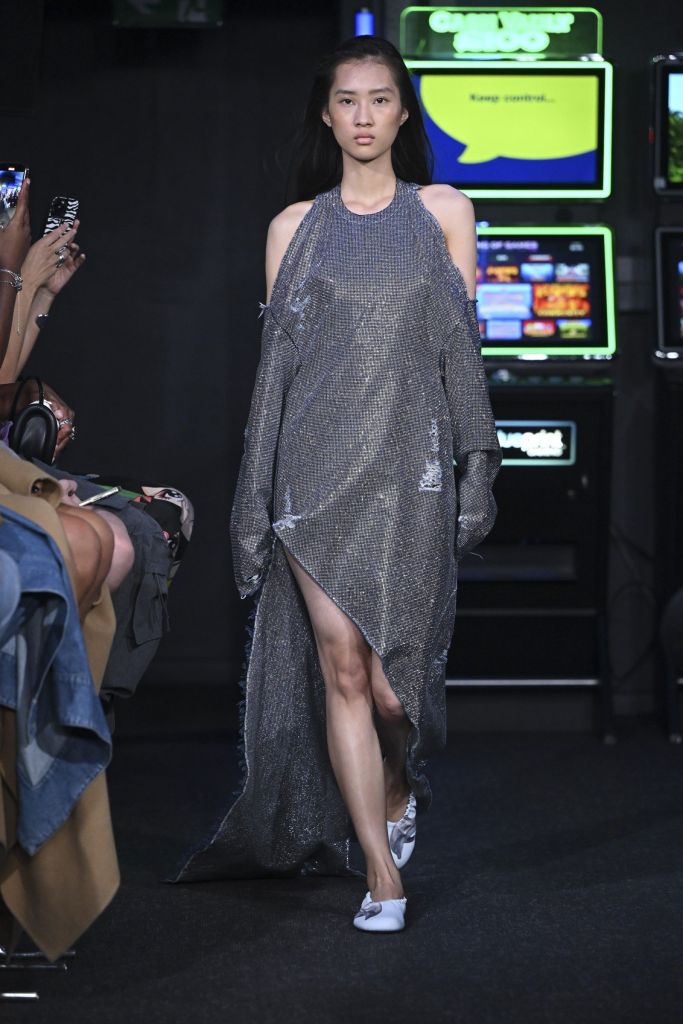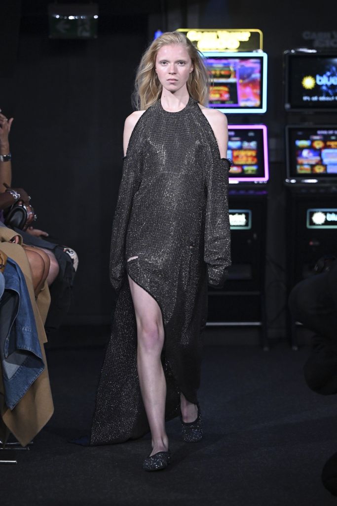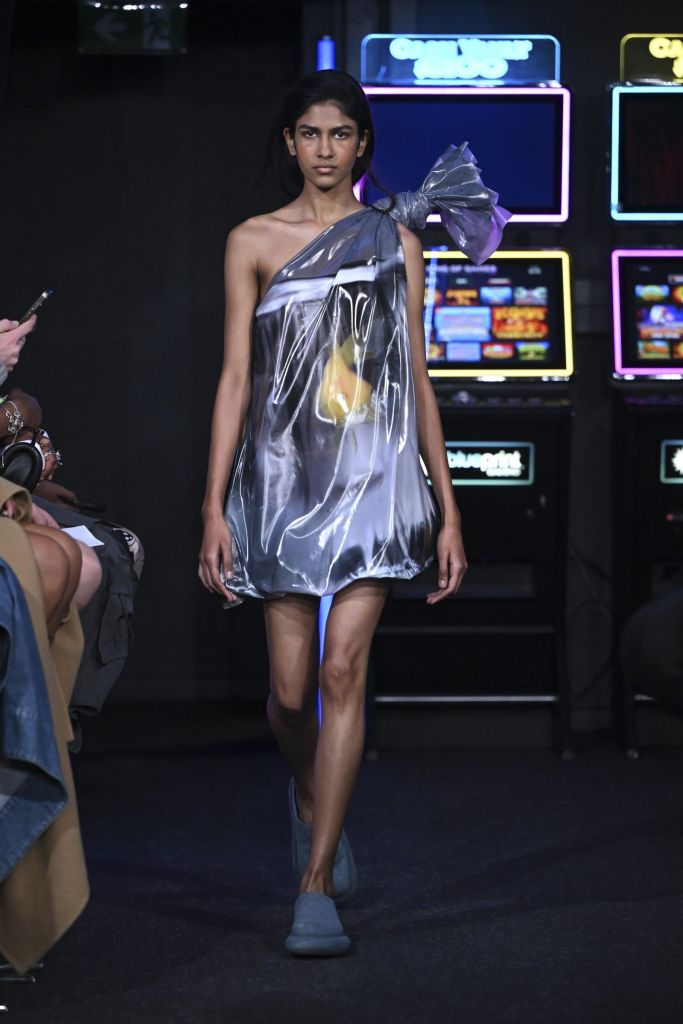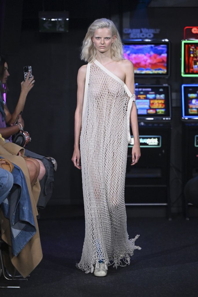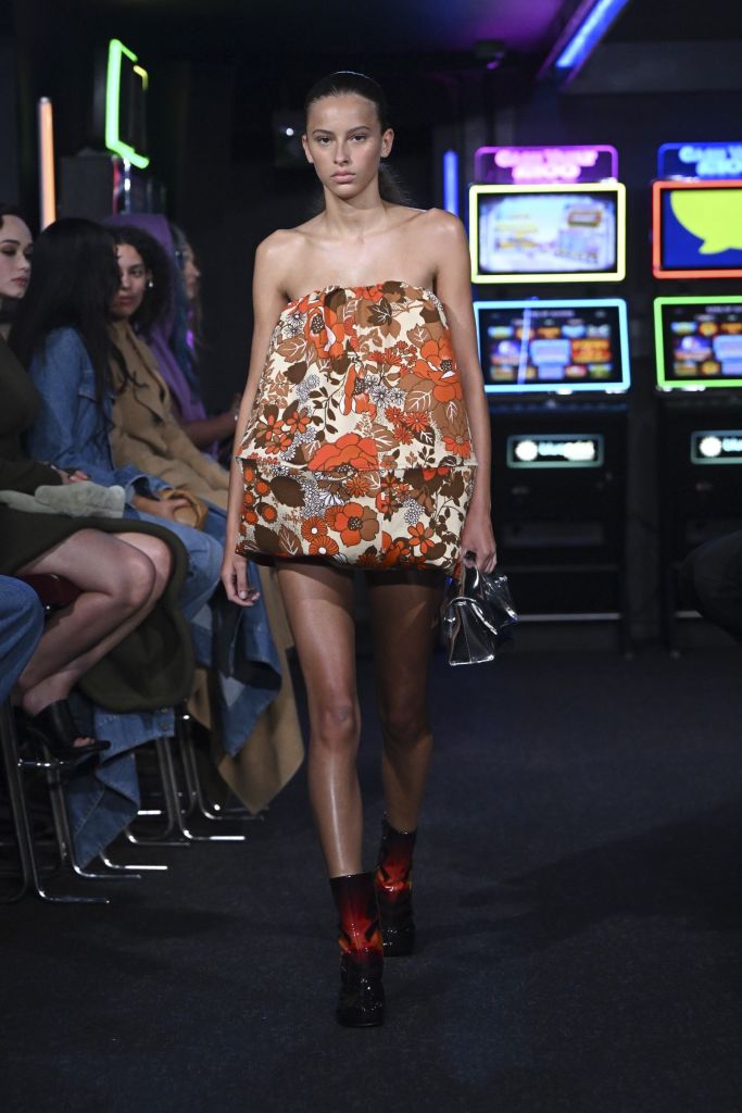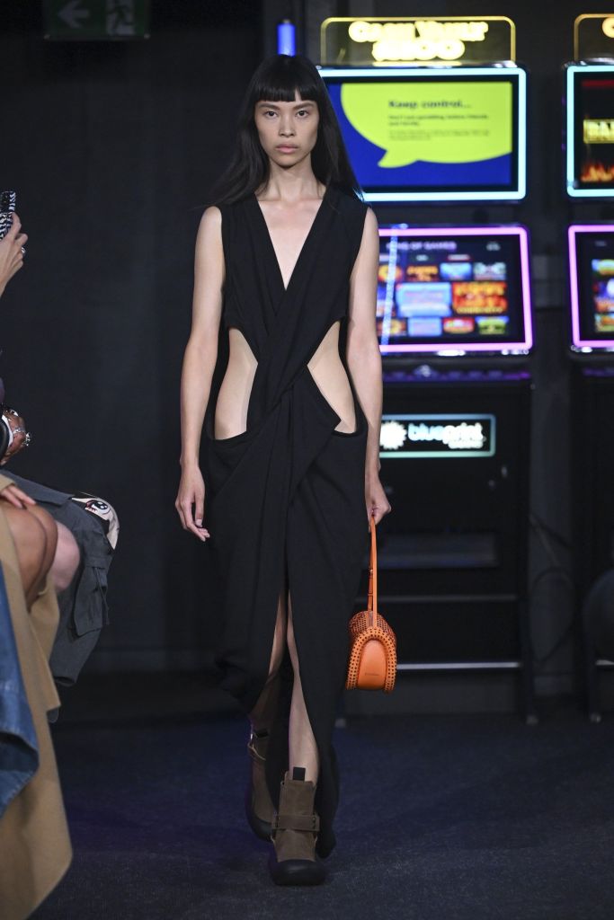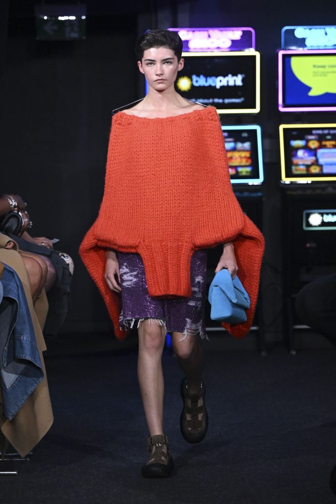 Jonathan Anderson‘s SS23 presentation, held yesterday in a vintage arcade in London, had a bizarre Alice in Wonderland feel to it. The garments and styles looked like alienating abstractions of everyday items, sarcastic reversals of a reality that continues to switch with the virtual and vice versa. In a world where the physical WORLD and metaverse interact paradoxically, amidst identity changes, and in a liminal space suspended between the two worlds that is symbolized by the arcade that becomes a metaphor for technology, the reference to our relationship with technology remained prevalent. Tops made entirely of keyboard buttons and prints from stock photos used as wallpaper speak of the “nature filtered by digital ego” in this world.
