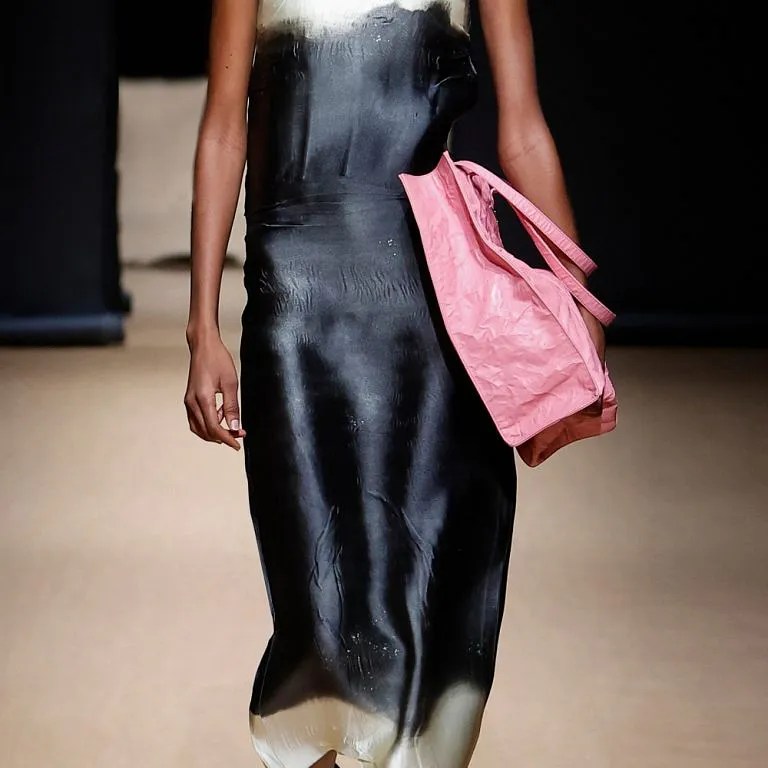 Some lightness and softness only appeared in the middle of the lineup, with the arrival of satin slip dresses and translucent skirts that recalled Prada’s panelled skirts from its Fall/Winter 2022 collection. The show was dominated by muted colors like dark grey and nudes. But even these ostensibly “happier” outfits have subversive elements, such shredded and frayed hemlines.