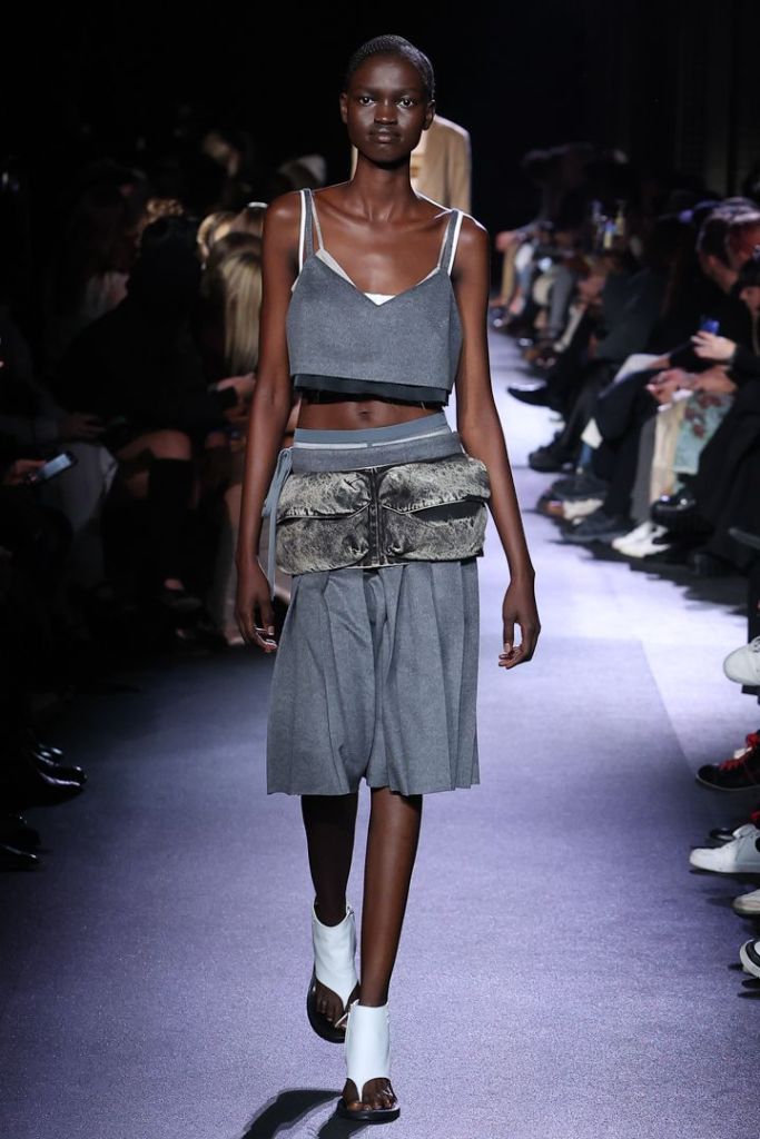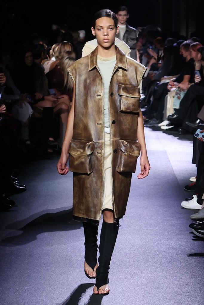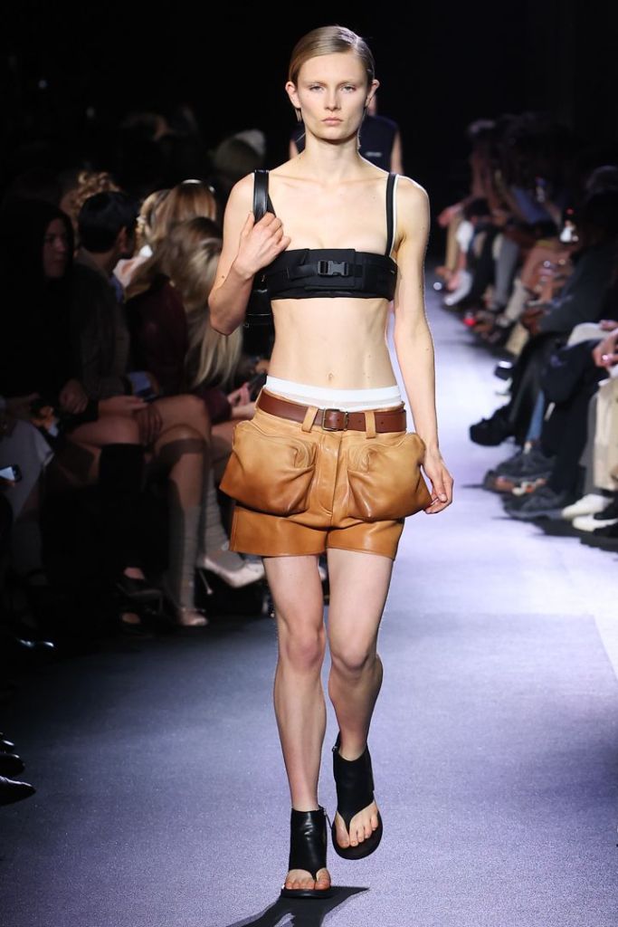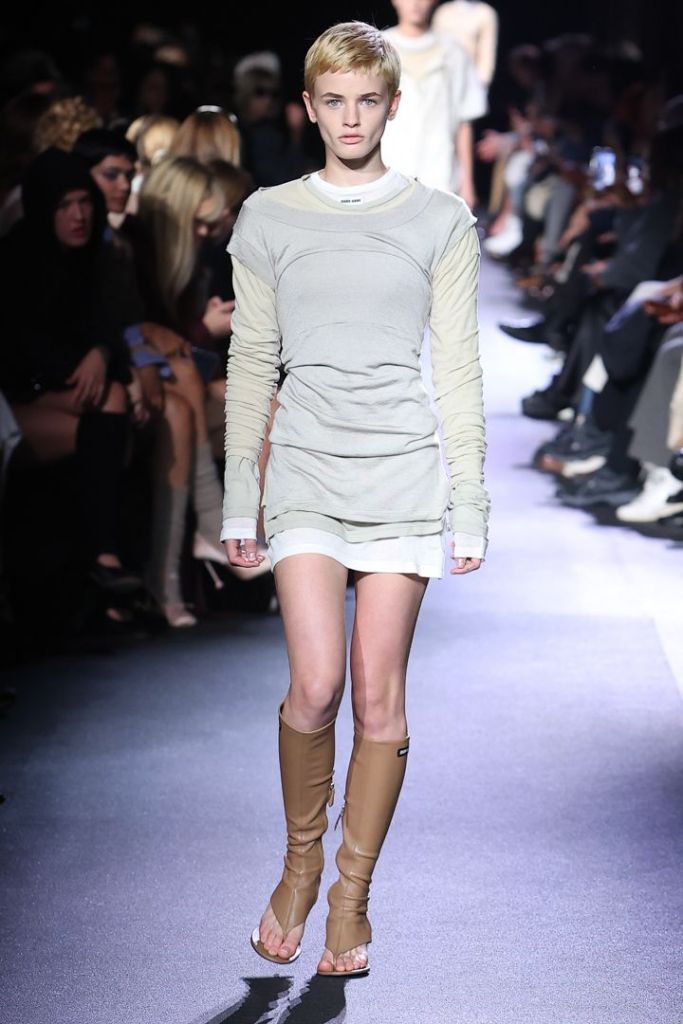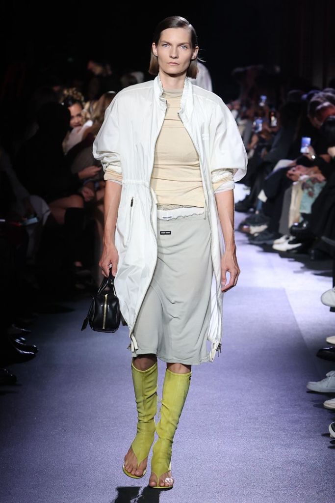 The Miu Miu SS23 collection debuts in the hypostyle hall of the Palais d’Iéna, in a setting designed by studio Amo and artist Shuang. As in previous seasons, Miuccia Prada continues to reread and dissect the conventions of Y2K fashion while playing around with sensuality, utilitarianism, and bourgeois codes. We see inch-long sweaters, low-waisted miniskirts with frayed hems, pleated skirts, overlapping plush minidresses, blouses, tops so cropped they become simple brassieres, and tailored jackets and coats that alternate technical fabric, leather, and washed denim on the runway, worn by a cast that includes FKA Twigs, Bella Hadid, Emily Ratajkowski, Miranda July, and Ethel Cain. The pockets that enliven each garment, resembling a kind of saddlebag or fanny pack, are the genuine must-have accessory between overlays, bling-bling embellishments, and transparencies: from pleated skirts to minis, from leather jackets to denim longuettes. While hybrid footwear, which combines the design of supple, knee-high leather boots with the toe of a flip-flop, stands out on the feet.