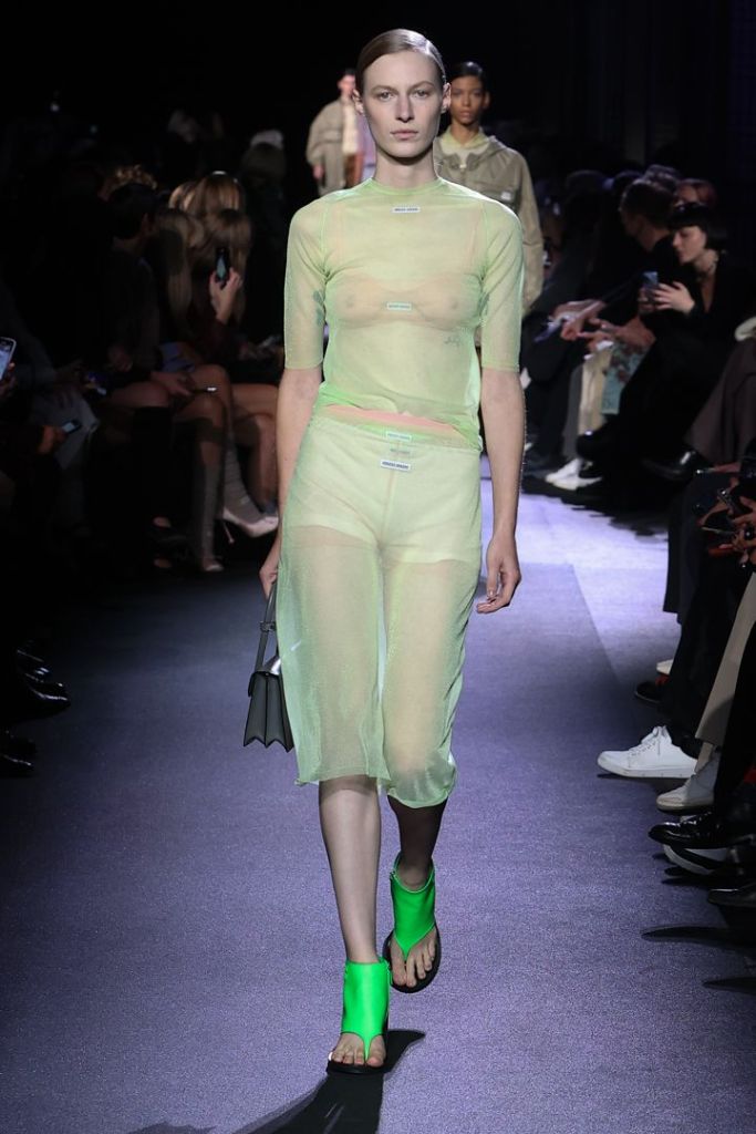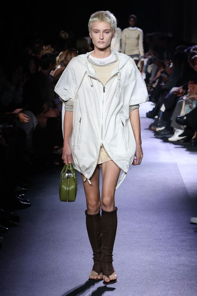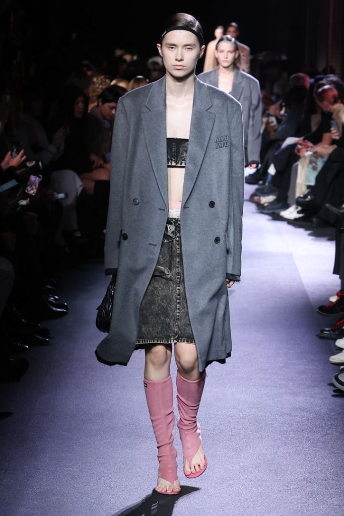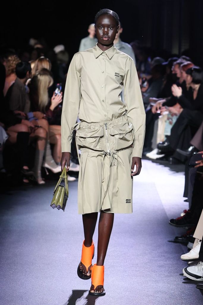 In a message, Miuccia Prada discusses an idea that seems to be summarised in the show’s final design. FKA Twigs walks the runway wearing a micro skirt decorated with maxi pockets and a blue ribbed sweater from which the collar and cuffs of a white shirt come out while sporting a soap-and-water face and her hair pulled back in braids.She is stunning, but in her simple but ultra-modern costume, she resembles one of the numerous schoolgirls we see on TikTok. She is an example of elegance that, with the help of Miu Miu, manages to disturb even the most traditional of looks. Miu Miu is Miuccia Prada’s answer to the world around us, a space of reflection on the real where divertissement and utilitarianism combine to create today’s clothing, if “fashion is a means of transferring a reaction to reality into tangible form.”