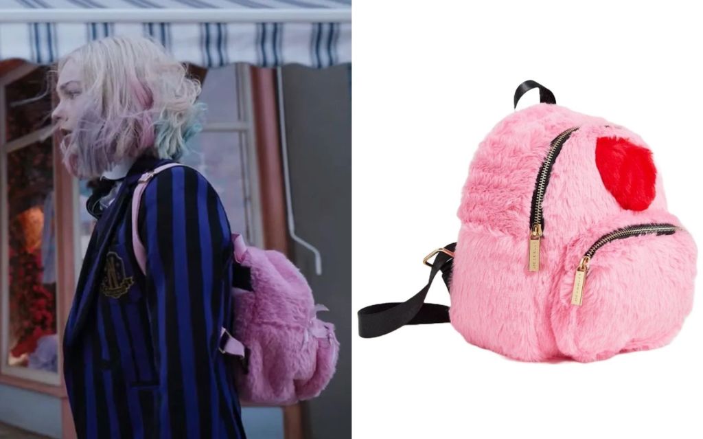 A sadistic outsider who “doesn’t let herself be influenced by anyone and always remains herself,” but who the Netflix format views as a sort of feminist heroine impervious to setbacks, betrayals, and loneliness Wednesday by Tim Burton is a bit of an outcast. She starts out stiff and distant, but as the episodes go on and she spends more time at the Nevermore Academy, she begins to relax. And the clothing alone can communicate the story, or even better, the accessories. The Cambridge Satchel & Co. backpack with its definite, square lines, which she always carries on her shoulders (sometimes switching it out for a shoulder bag by the same company). the exact opposite of her roommate’s model. Enid Sinclair is a riot of color and warmth, which is reflected in her tricot sweaters, her hairy bag (a hint that she might be a werewolf? ), and the little Alba Heart Backpack in pink by Skinnydip.