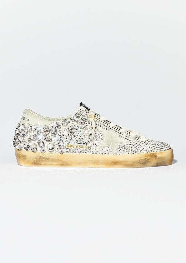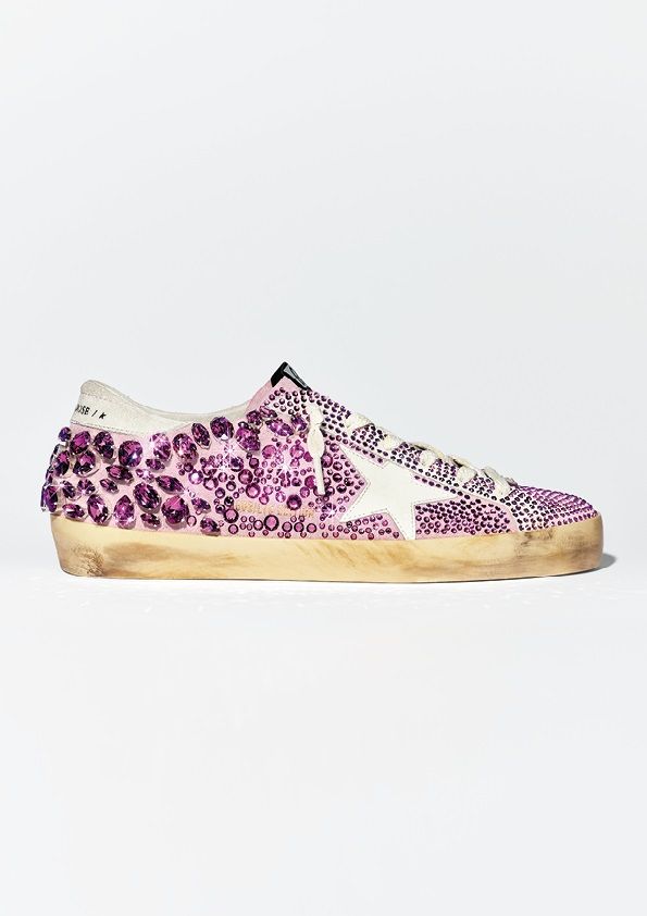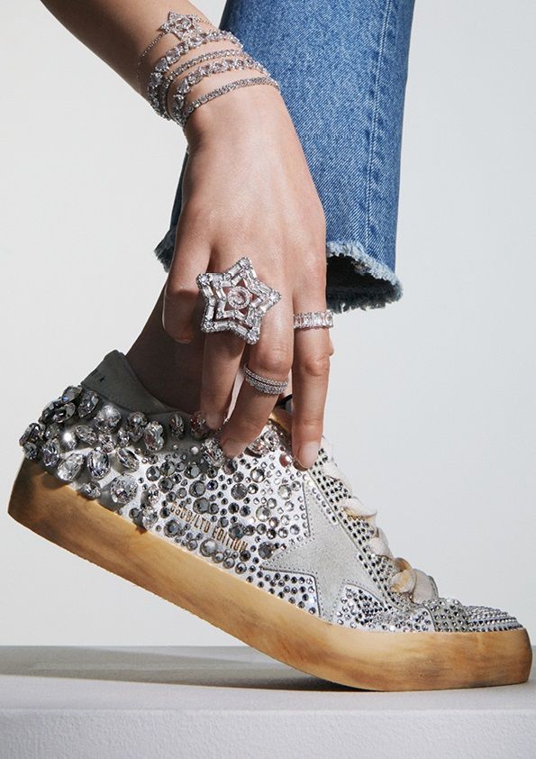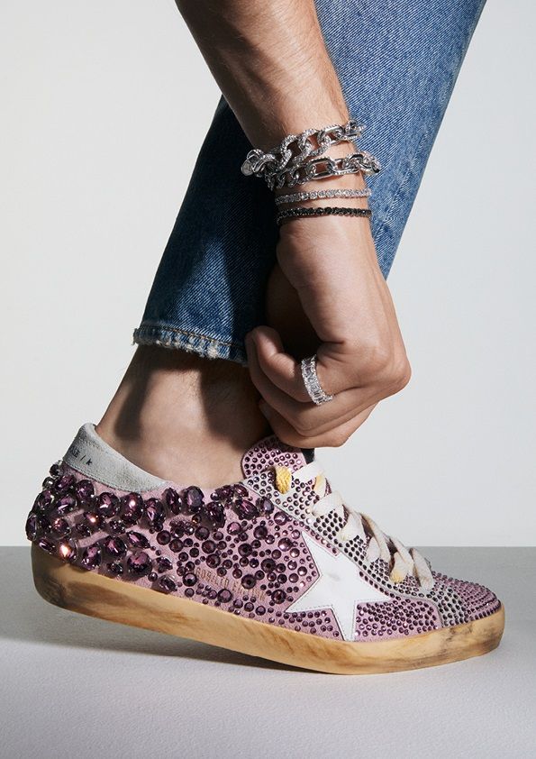 With the help of a fresh collaboration with Swarovski Creators Lab, Golden Goose’s stars are about to shine even brighter. A very special rendition of the Super-Star model and a highly exquisite and sparkly skateboard are the stars of the little capsule collection that the Venetian brand and the hub that houses Swarovski’s best partnerships have created together. The first to showcase the star and inspired by the Californian skate world of Los Angeles, the classic Golden Goose trainer was designed in light while visiting the Venice Beach skate park. In time for the upcoming celebrations, two new versions—a pink one and a white one—both made by hand—are now available in retailers. The pink shoe is a suede design with a white leather star, an icy suede heel, and pink crystal embellishments all throughout. The second shoe is made of white leather with white leather stars, a suede heel and inlays, and is further adorned with transparent crystals of various sizes and shapes placed all over the shoe.