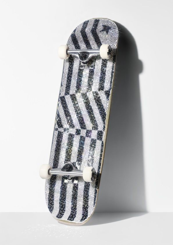 The limited edition (only 100 pairs) pink trainers from the Golden Goose for Swarovski Creators Lab collaboration are only available online, while the 10 skateboards are also only available in a limited edition (only 250 pairs) and exclusively on swarovski.com and in select Swarovski and Golden Goose stores. The latter, which include a crystal design modeled after the Golden Goose flag, are truly collector’s items of art. The lower portion is covered in translucent, grey, and black Swarovski crystals. The upper black portion has a thin crystal band with the trademarks of both manufacturers.
