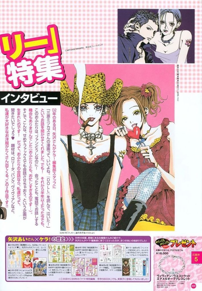 Ai Yazawa’s manga takes on the form of a veritable encyclopedia of fashion, set against a backdrop of complicated love affairs and adolescent uncertainties, with the publication of “Paradise Kiss” in 1999. It contains early references to the punk/visual kei movement, outfits in pastel shades in full fairy kei style, reminiscences of glam rock, and nods to Victorian lolita style. However, Ai Yazawa solidifies her relationship with fashion and pays respect to the fashion designer who captured her heart with “Nana,” her most famous manga. After an accidental encounter on a train, the lives of two girls named Nana—Nana Osaki, a hard-core punk singer, and Nana Komatsu, a sentimental and naive twenty-something—were permanently entwined. One cannot help but note that Nana Osaki, the main character, wears Vivienne Westwood’s distinctive “Sovereigns Orb” insignia, which is made up of the Orb of the Sovereign of England and the ring of Saturn, in every frame and vignette of the manga.