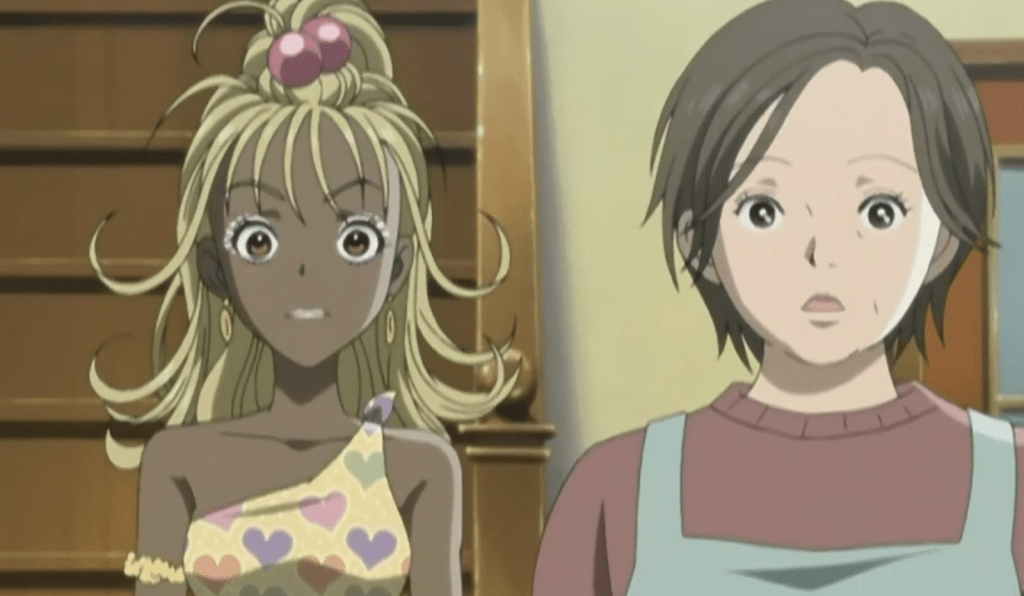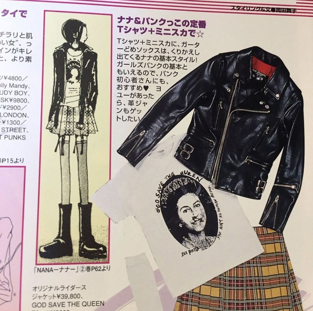 The character of Ren, Nana Osaki’s boyfriend, who is nearly a reverse cosplay of Sid Vicious, with spiky hair, a leather stud, and a chain tied with a padlock around his neck, must be brought up while discussing the Sex Pistols. After all, Vivienne Westwood’s top models were the forerunners of British punk music, and Ai Yazawa attempted the same careful styling for the rock bands shown in her comic book, the “Black Stones” and the “Trapnests.” The “Red Heart Jacket” is unquestionably the most elegant item featured in the manga among tartan suits, bondage pants, corsets, and torn T-shirts. It is a double-breasted velvet blazer from the “Red Label” line introduced in 1999 with a black heart-shaped fastening. The “Rocking Horse” shoe, an oriental-inspired shoe introduced at the 1985 “Mini Crini” fashion show, is the most enduring presence on the feet of the protagonists in the wake of this style, second only to the renowned “Ebury Bag” that goes with numerous female characters throughout the shjo. Ai Yazawa, on the other hand, enjoys drawing the “lightning bolt” fashions of the turn of the century, such as the ganguro or gyaru: hyper-tanned young girls with fake eyelashes and pearly powder, discolored hairstyles, and glittery accessories, all of which are decidedly kitschy, in her most recent manga.