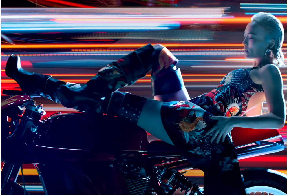 In contrast to Klementieff, who is riding a motorcycle while dressed in a little dress with flowers and birds and Cuissardes boots, Naomi is shown standing in front of a street that is depicted in the middle of the night wearing a short jacket and matching black pants. Fast-moving automobile light strings may be seen behind her, reflecting the hues of her clothing. The ad, which draws influence from Sarah Burton’s SS23 collection for Alexander McQueen, promotes female strength and originality thanks to the eclectic personalities, nighttime London, and Kerlund’s appearance.