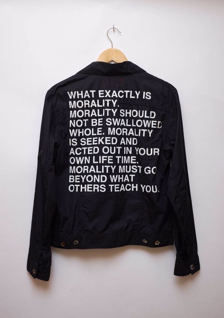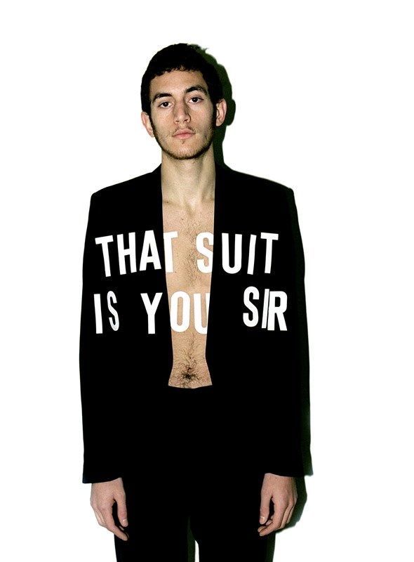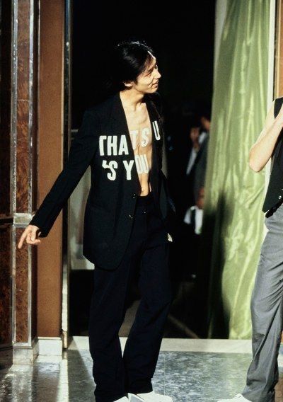 According to prominent Japanese designer Yohji Yamamoto, “I think my men’s clothes look as good on women as my women’s clothes,” he told the New York Times in 1983. “I always wonder who made the decision that men and women should dress differently. When it comes to FW21, the writing multiplies and breaks apart covering a two-piece suit, with brief, hermetic, winking or evasive words embellishing strictly black genderless clothing. “Forget me not” is written on a coat from SS04, but the print “Will be back soon” peeks out in place of it in FW17. Martin Margiela, who debuted a screen-printed suit in 1999, was likely the first to do it. The spring/summer fashion show featured a sort of greatest hits: the trompe l’oeil prints alluded to those shown for spring ’96, the man-sized doll dresses alluded to autumn ’94, the Stockman mannequin tops alluded to spring ’97, and to close the show, a print reading “This suit is yours sir” ran across the model’s black blazer and bare chest.