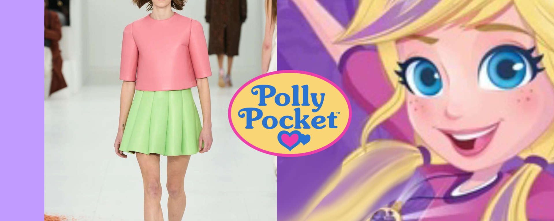 The fashion industry does not seem to have forgotten Polly Pocket, a fashion doll with an intriguing and appealing clothing, despite the fact that cinema has moved on to another Mattel product. Polly Pocket’s wardrobe was more “plastic,” colorful, cartoonish, and sartorial than Barbie’s. Jonathan Anderson, who exhibited certain pieces in Loewe’s FW23 collection that appeared to have been stolen from Miss Pocket’s range of shirts, dresses, shoes, and accessories, must have been one of the kids who grew up with Polly. The structured peplum skirts, shoes, and sunglasses with bulging frames, but notably the ensemble of a pink pepto bismol crop top and a lime green pleated skirt, screamed “Polly Pocketcore” with unmistakable force. On the other hand, Miuccia Prada appears to have dressed Polly’s more sophisticated side with the Miu Miu FW23 show and a collection of short dresses in shining leather.