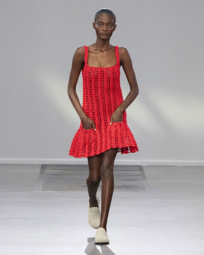 In the realm of JW Anderson, every collection is a testament to the artistry of footwear, and this season’s headliners were none other than beach sandals. These iconic children’s fashion essentials received a splendid reincarnation, fashioned from embossed leather in sumptuous brown, vibrant orange, and creamy shades, proudly bearing the brand’s emblem. Playful crochet moccasins and mules peeked mischievously from beneath the cargo trousers of many models. And for those who favored a dash of sophistication, suede loafers graced the runway, featuring kitten heels—a twist on the classic grandmother’s slipper, albeit with a touch of youthful flair, as Anderson candidly admitted.