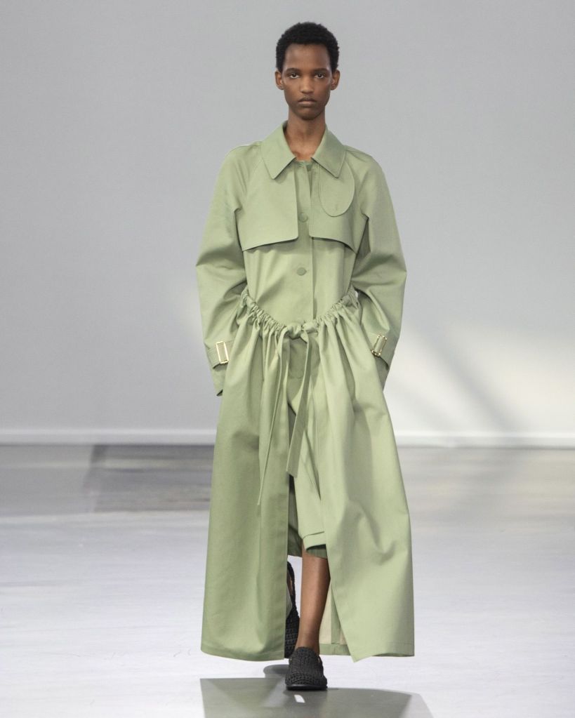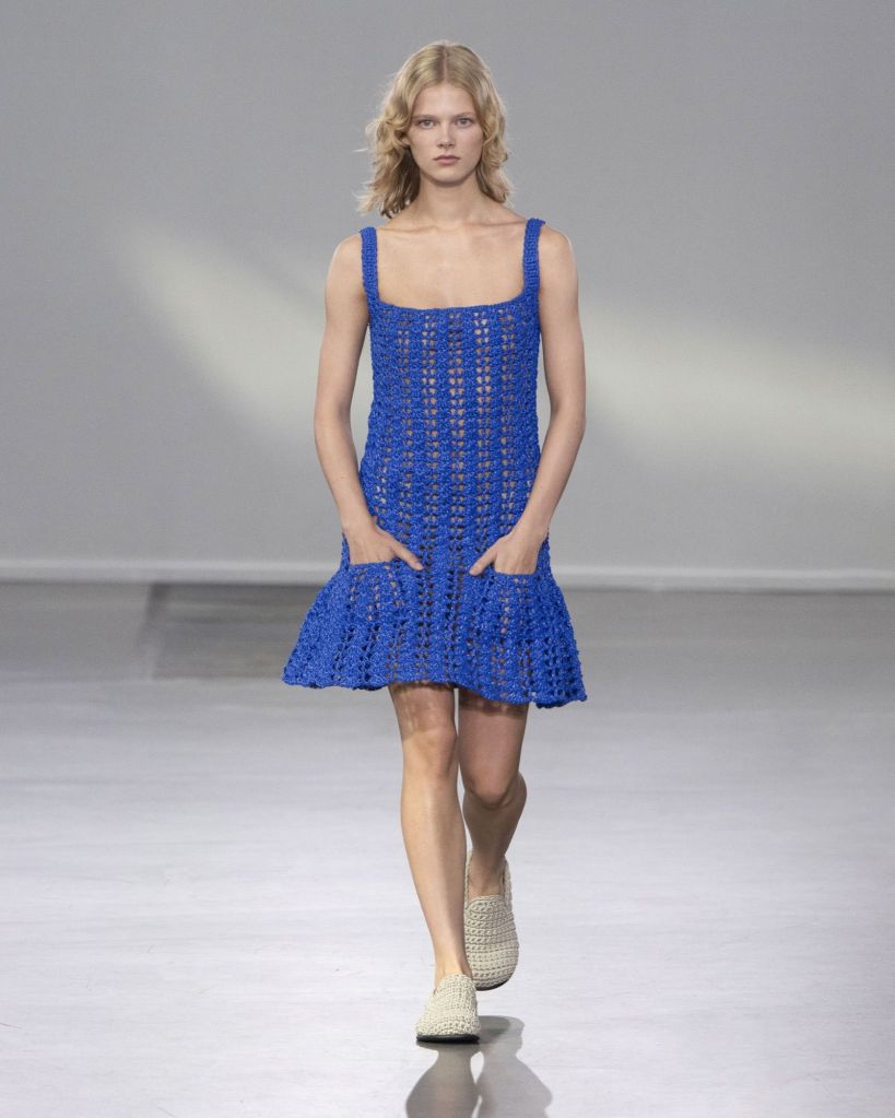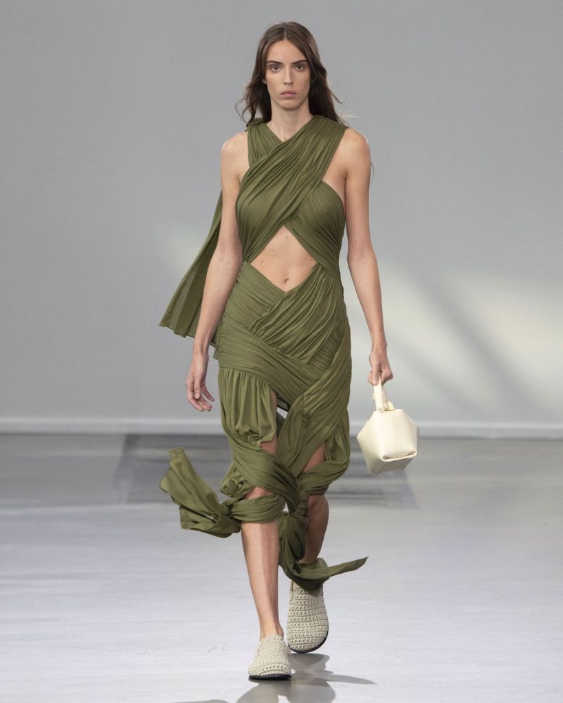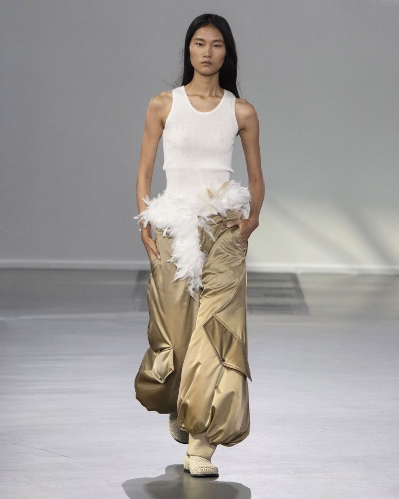 Amidst the kaleidoscope of styles that playfully celebrated the brand’s ingenious heritage, this collection revealed a pragmatic twist. Enter the stage: mint green and beige trench coats, masterfully sculpted and cinched at the waist, embodying the timeless allure they’ve always exuded. The bomber jackets, bedecked with ethereal white feathers, continued their reign as style staples, as did the forest green cotton tracksuit trousers adorned with artful panels. Meanwhile, the evening dresses, sensuously draped over the models’ forms, whispered tales of elegance. And let’s not forget the crocheted dresses—a charming flashback to the sultry summers of the long-lost 1970s.