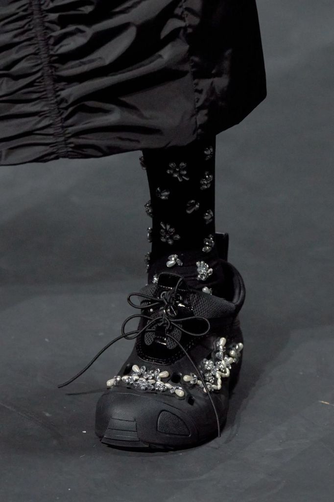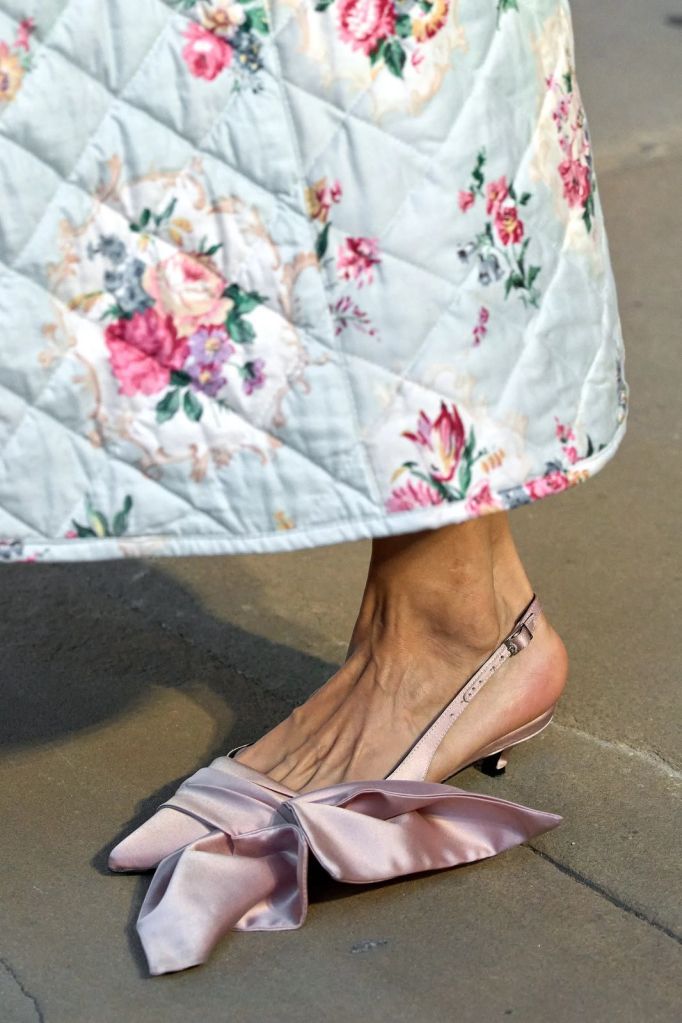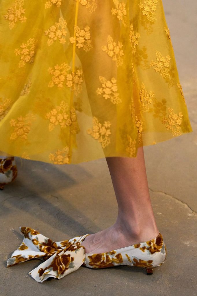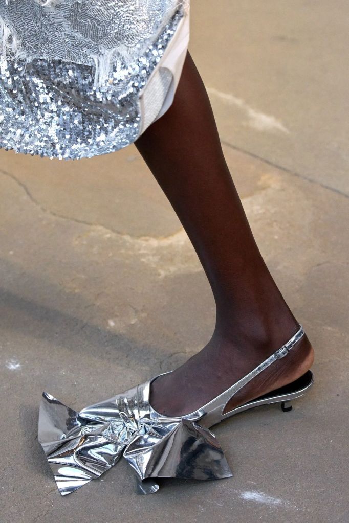 Simone Rocha, the talented Irish iconoclast, boldly collaborates with Crocs, transforming fashion’s adored “ugly sandals” into objects of desire, bedecked in a cascading waterfall of pearls. Erdem, on the contrary, introduces pointed golden shoes crowned with dramatic maxi bows. Roksanda delves into whimsy with high-heeled sandals enveloped in lavish feathers, while 16Arlington’s pumps shimmer with colossal sequins, mirroring the grandeur of their dresses.