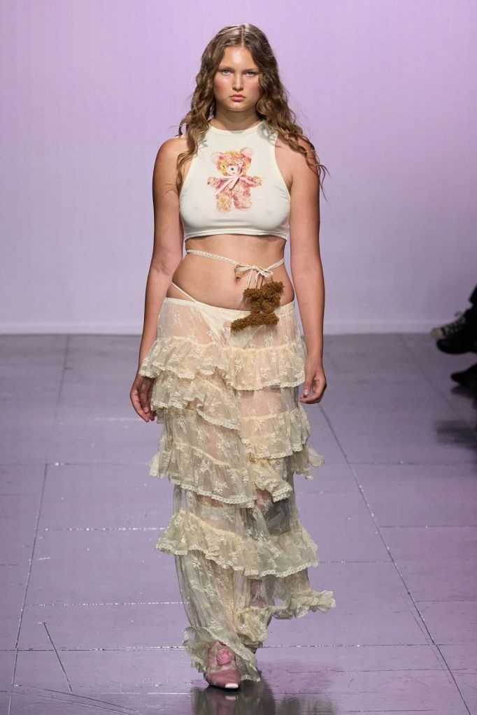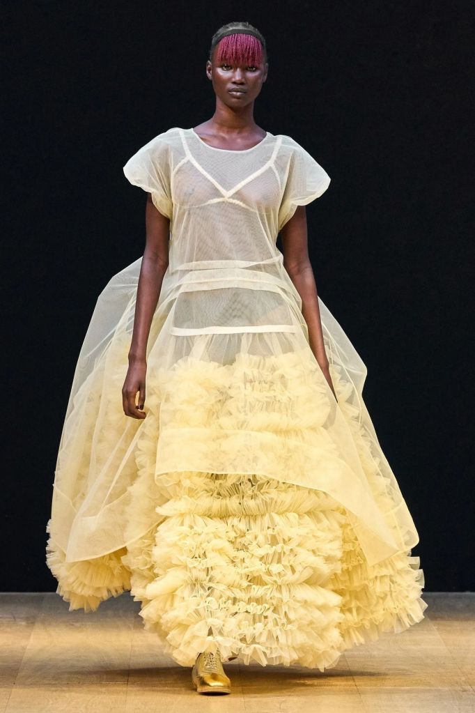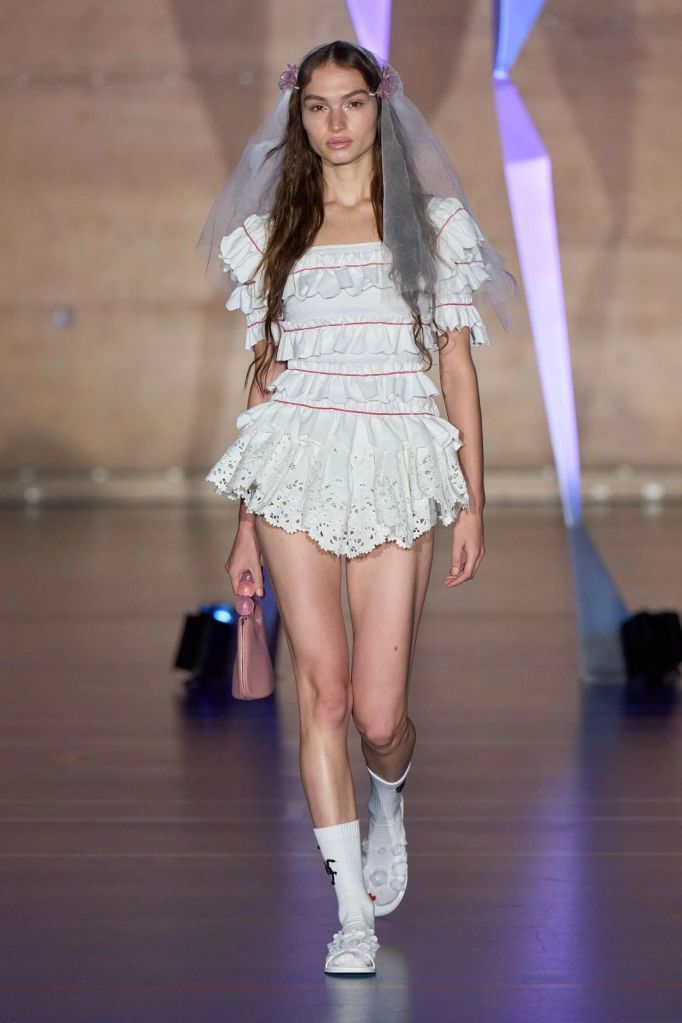 Indulging in adoration for cutecore, balletcore, and coquette styles becomes irresistible, even as the seasons transition to SS24. The visionary designers persistently grace the runway with ensembles tailored exclusively for “dollettes,” brimming with diverse silhouettes, an array of hues, and exquisitely feminine accents. In the forthcoming months, a wardrobe without a Frou-Frou skirt, whether extending to ankle-length elegance or the flirtatious mini, would be incomplete. This model, adorned with cascading flounces and delicate ruffles, has seamlessly woven itself into the collections of the most illustrious brands that graced the London Fashion Week. To provide a glimpse, one need only mention Molly Goddard, Chopova Lowena, Susan Fang, and Yuhan Wang.