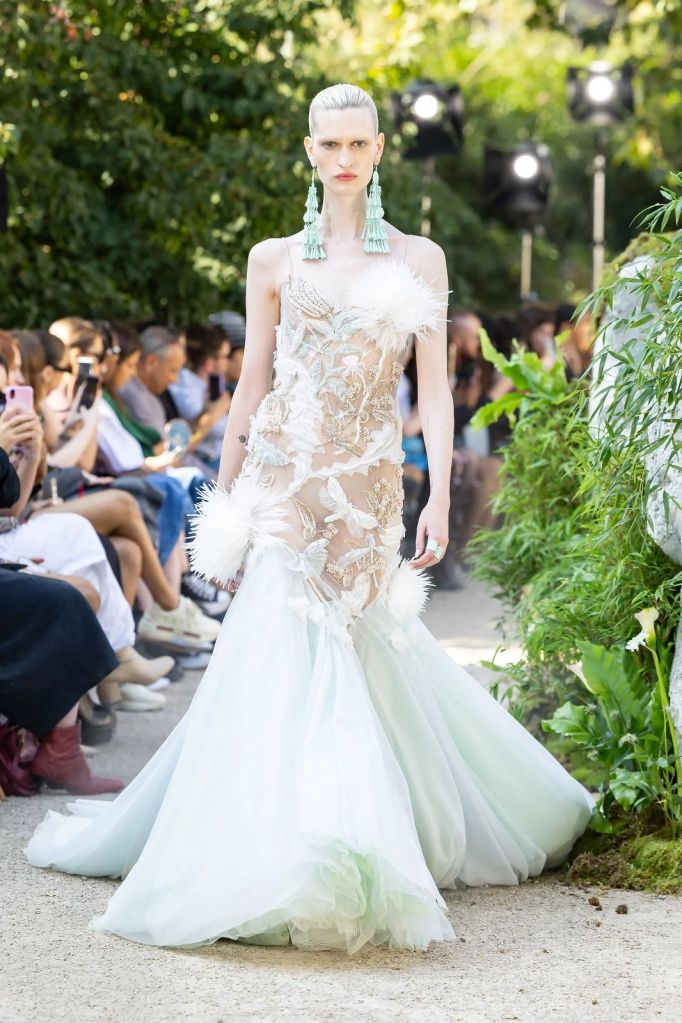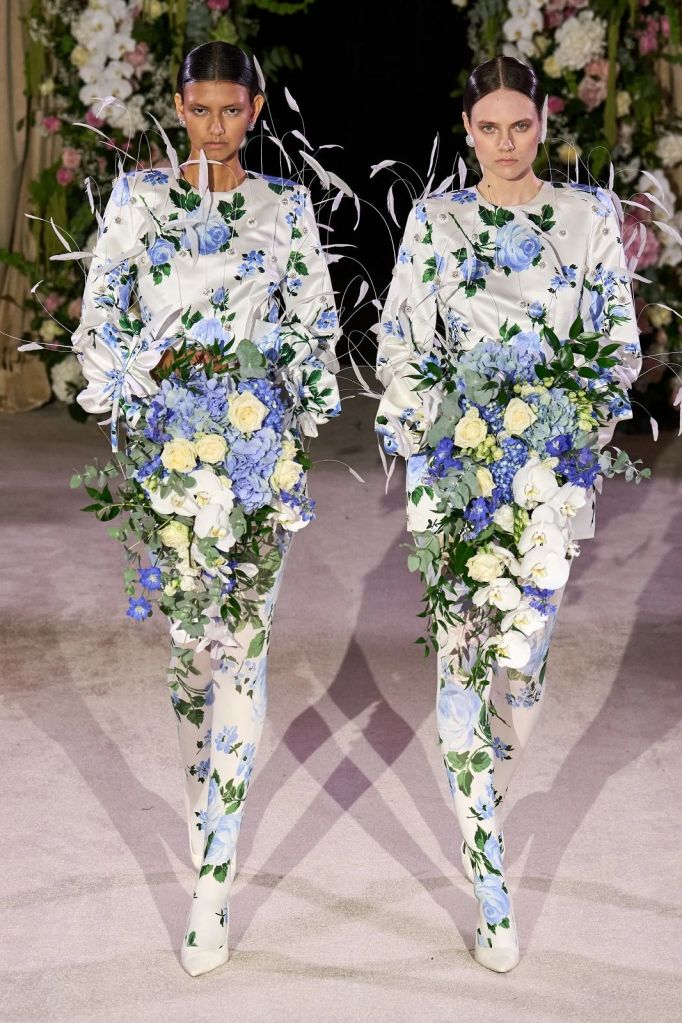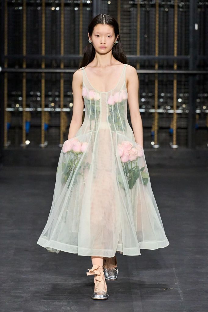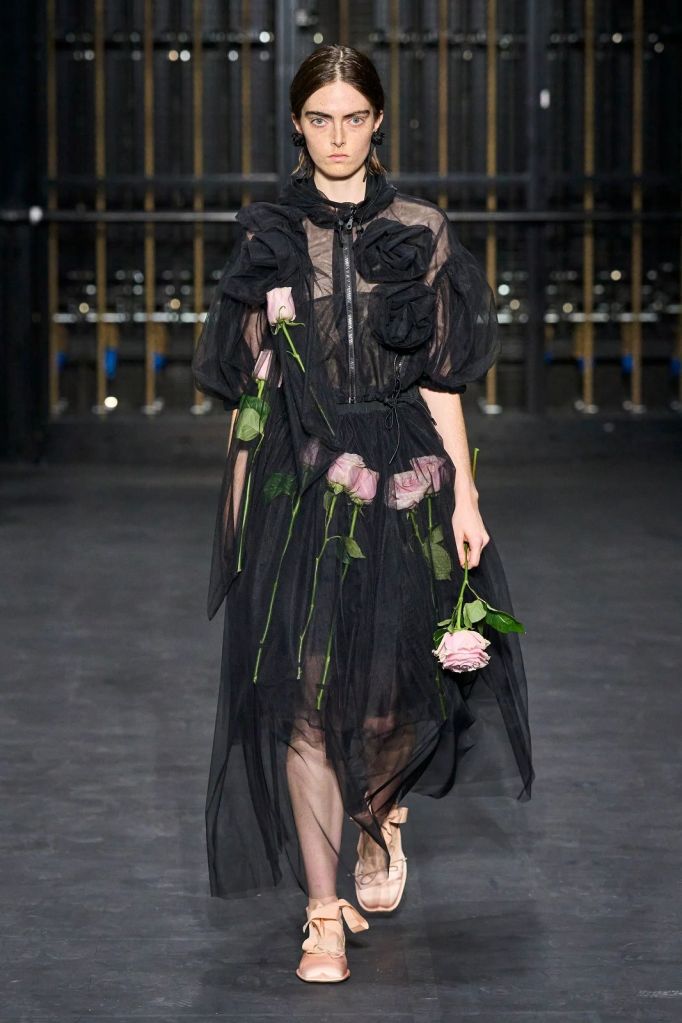 For the Spring/Summer 2024 collection, Simone Rocha didn’t merely use roses as decorative elements; instead, she delicately inserted slender pink rose stems amidst cascading folds of fabric, concealing them beneath layers of organza veils and ethereal tulle dresses. Rocha’s artistic vision extended to crafting intricate three-dimensional rosettes of fabric, adorning tops, trench coats, and skirts, infusing her designs with a garden’s worth of floral allure.