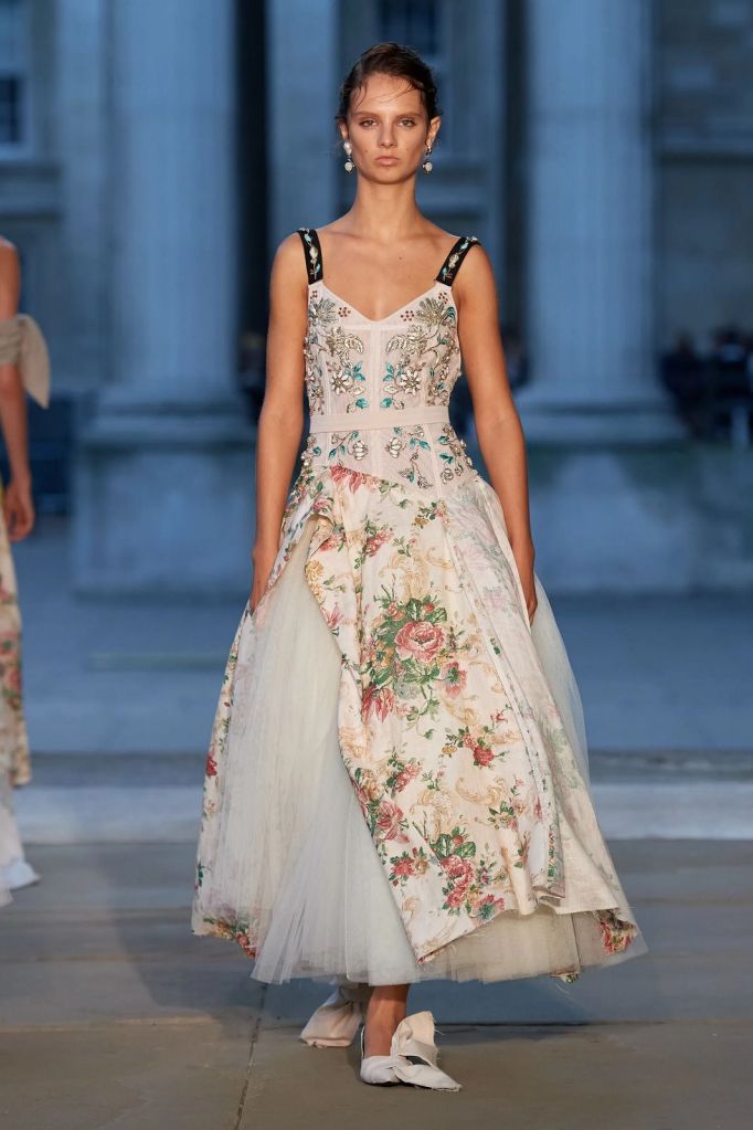 Erdem and Richard Quinn also ventured into the realm of blooming roses, with gardens of petals inspiring their gossamer dresses. Erdem, in particular, drew from a photograph of a youthful Queen Elizabeth II astride a motorbike during her military service in the 1940s. This iconic image served as the wellspring for a captivating series of dresses and minidresses, which not only evoked biker aesthetics but also paid homage to the English rose—the emblematic flower of the United Kingdom.