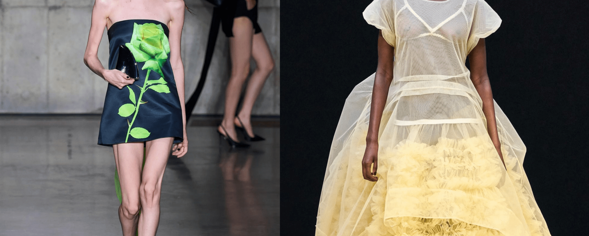 For the Spring/Summer 2024 collection, Simone Rocha didn’t merely use roses as decorative elements; instead, she delicately inserted slender pink rose stems amidst cascading folds of fabric, concealing them beneath layers of organza veils and ethereal tulle dresses. Rocha’s artistic vision extended to crafting intricate three-dimensional rosettes of fabric, adorning tops, trench coats, and skirts, infusing her designs with a garden’s worth of floral allure.