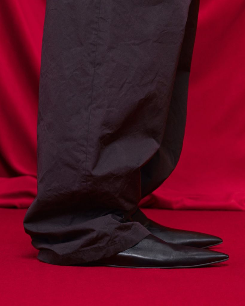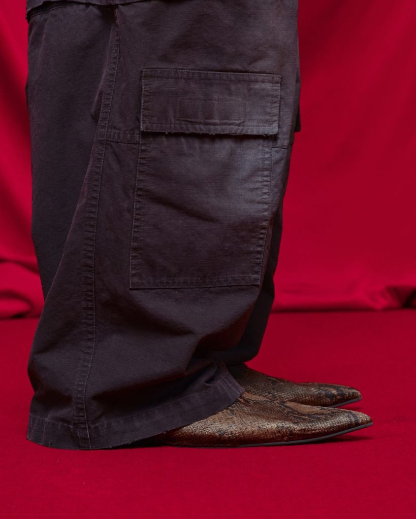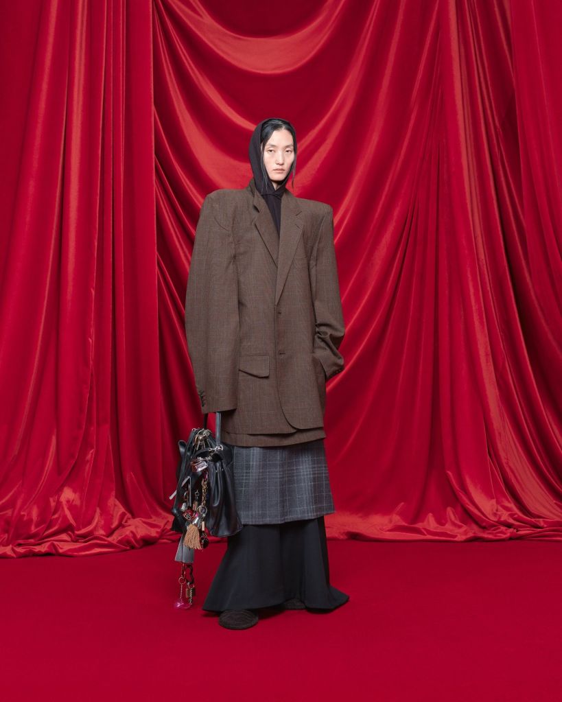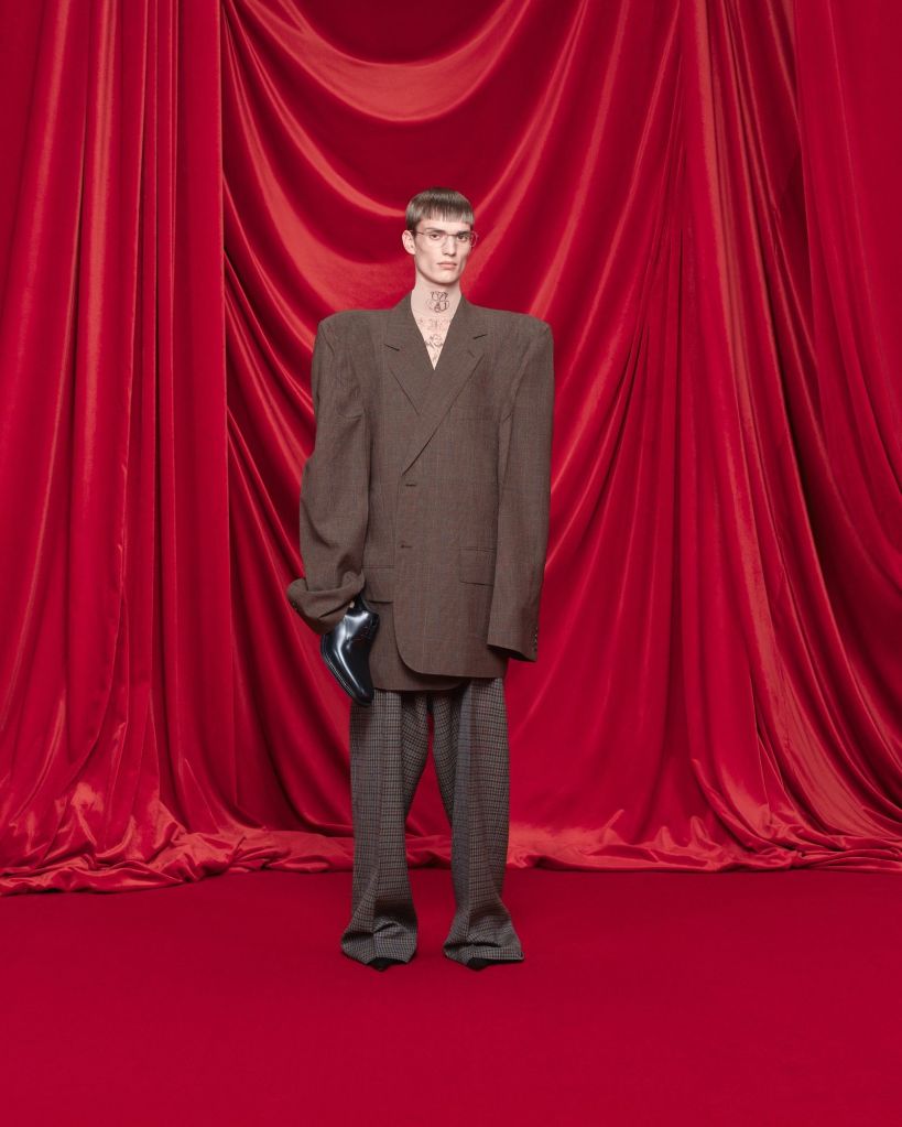 The exploration of unconventional jackets and coats takes center stage, with an oversized series that verges on the cartoonish, reminiscent of the exaggerated ’80s power shoulder look (picture The Babadook’s iconic silhouette minus the top hat) but devoid of shoulder pads or external supports. In both instances, Demna’s signature motifs resurface: the layering and doubling of garments, along with the artful use of trompe-l’œil techniques.