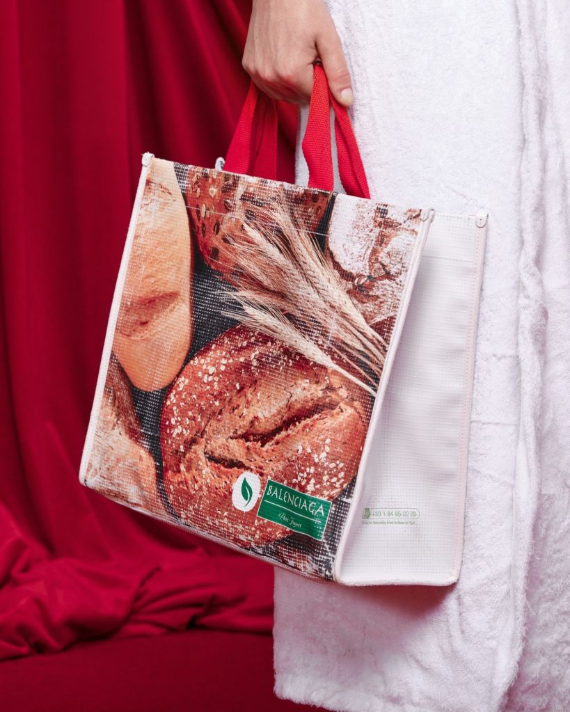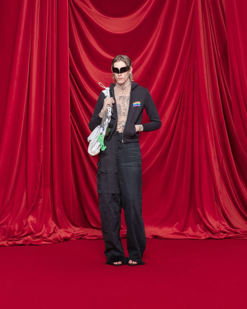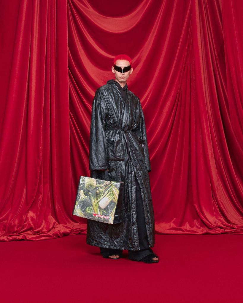 Another captivating chapter in Demna’s distinctive lexicon is the concept of “deceptive normcore.” Here, jogging suits, supermarket plastic bags, drawstring pants, robes, and track jackets come alive in unexpected ways. They transcend their mundane origins, transforming into fashion statements that challenge the status quo. Even travel bags are artistically “folded,” enhancing their disheveled appearance and elevating them to the realm of high-fashion chaos.