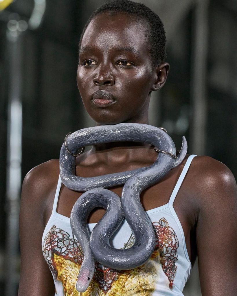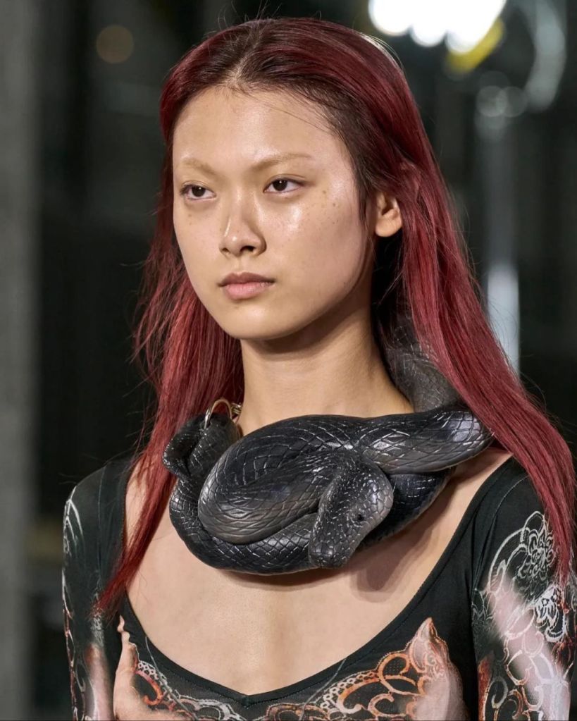 Now, here’s a tip to escalate the wow factor to staggering heights. Take a cue from the Y/Project models who walked the runway sans makeup, showcasing their natural, radiant skin. Let your face glow with an otherworldly luminescence, transcending the need for conventional makeup. Your visage, unadorned and pure, becomes a canvas of fascination that beautifully complements the serpents encircling your neck.