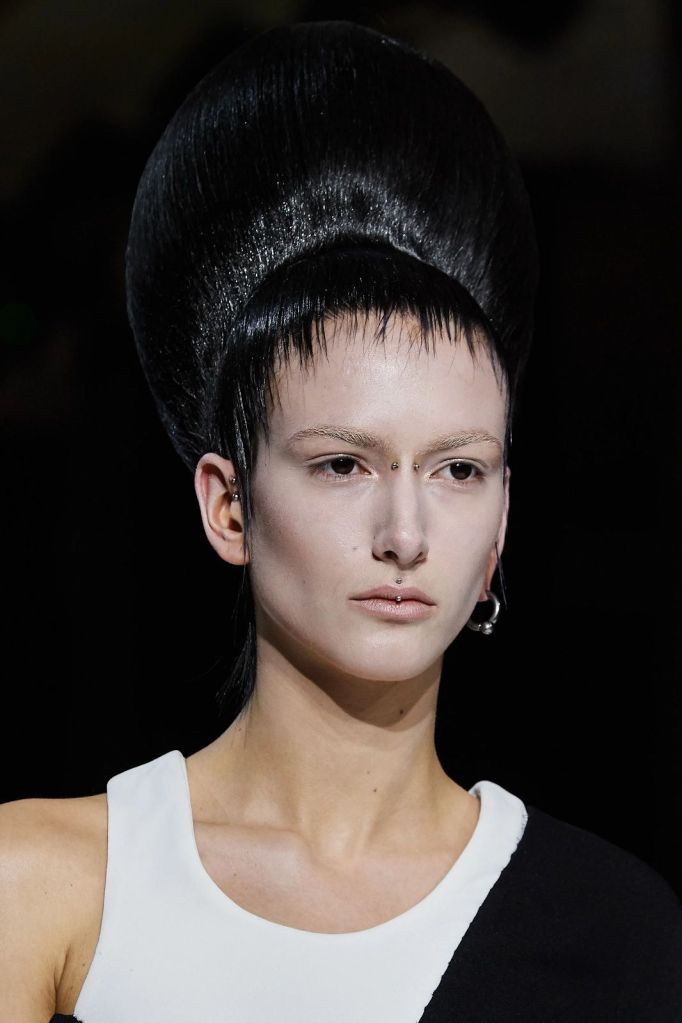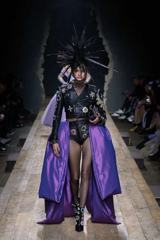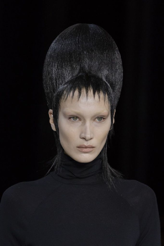 To achieve the aristo punk look, Moschino‘s beauty team wielded hairspray and straighteners, skillfully crafting a unique, edgy coiffure. The pièce de résistance was the makeup, where all attention was directed toward the eyes. Liquid eyeliner took center stage, creating a striking visual impact. The innovative addition of a suggested comma, styled like the crests of punk’s rebellious past, added an element of rock and roll chic.
