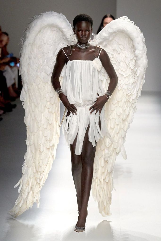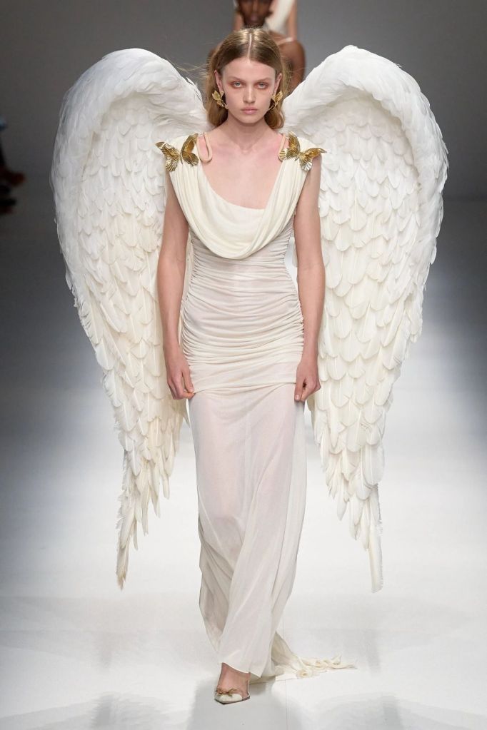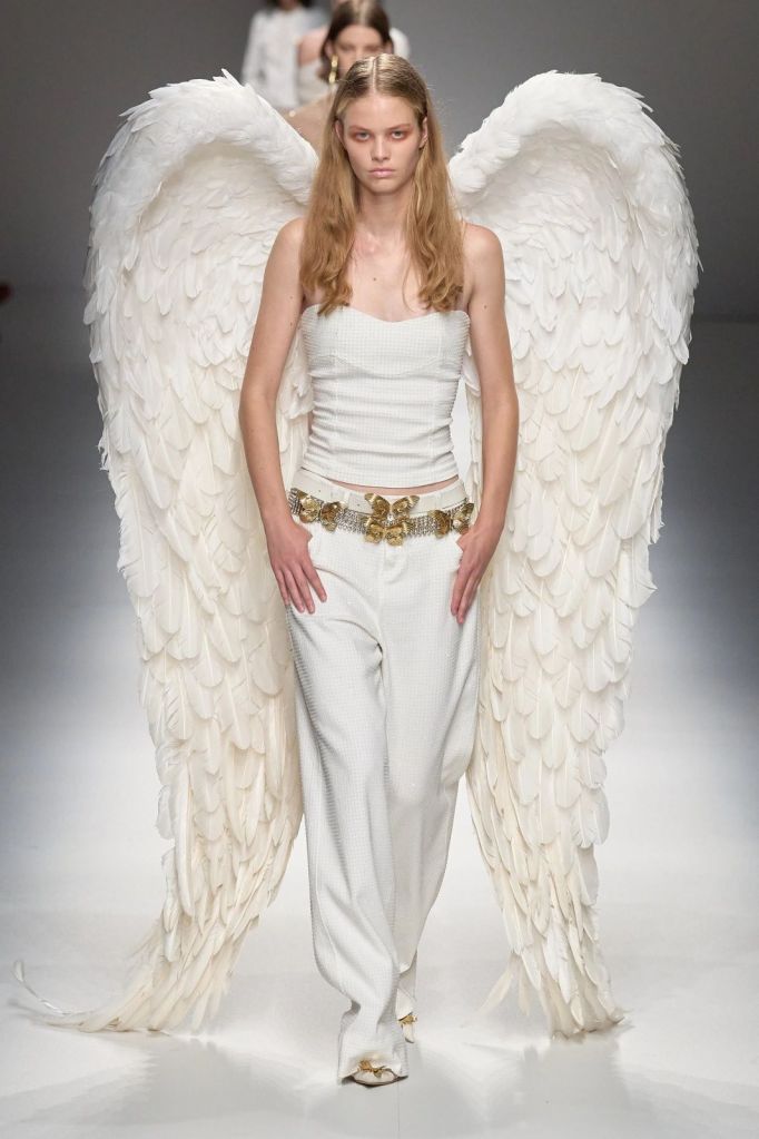 Nicola Brognano‘s visionary runway transforms the Blumarine catwalk into a realm of sinful and sensual fallen angels, a seductive vision of ethereal rebellion. Adorned with grand wings that gracefully cascade from their shoulders, these angelic figures are clad in the purest white, with tantalizing accents of gold and delicate butterflies that add a touch of whimsical enchantment.