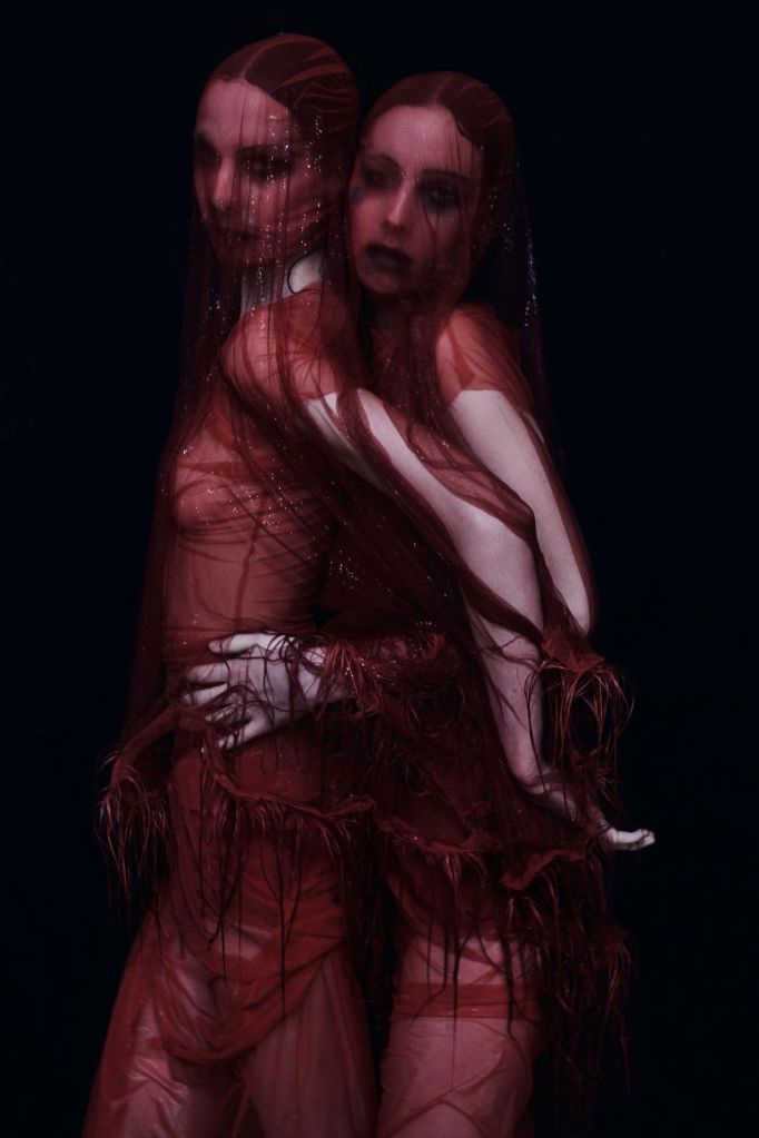 Their very long, wet hair, meticulously crafted by the talented Anthony Turner, is a visual masterpiece. Cascading down, it drapes sensuously around their bodies, glistening like tendrils of seaweed in the depths of the ocean. Small pendants of light accentuate this aquatic charm, casting a bewitching glow upon the mermaids.