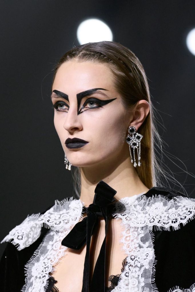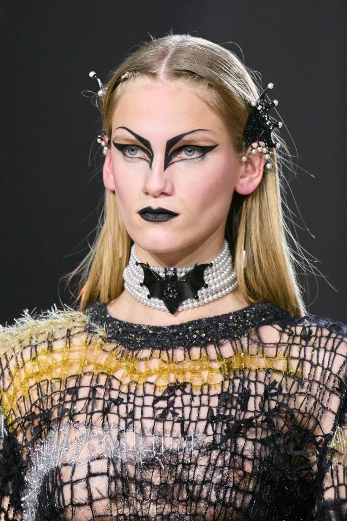 The predominant hue is black, casting a shadow over the entire collection. Even in the realm of beauty, darkness prevails. The models don a gothic chic look with their pale, dewy complexions, as if they’ve stepped out of a medieval tale. Black eyeshadow frames their eyes, creating an aura of mystery and intrigue. Their lips are painted a deep wine-red, a shade of passion amid the darkness.