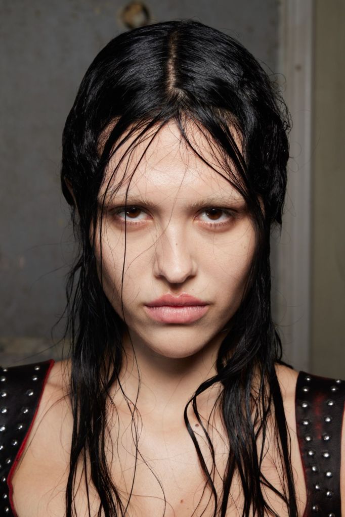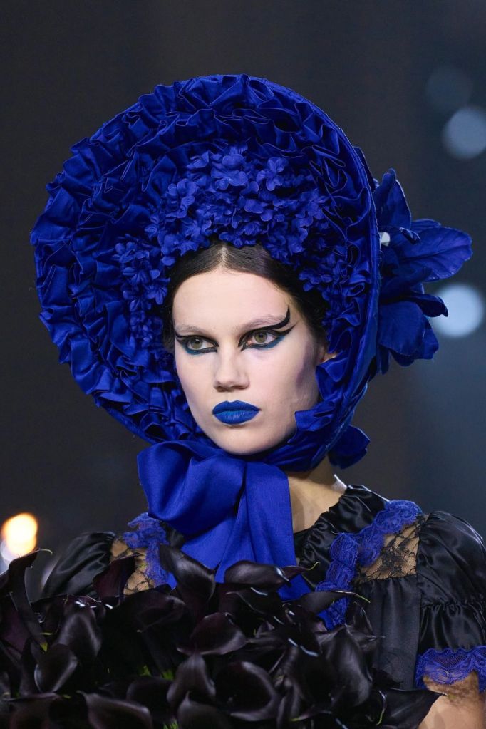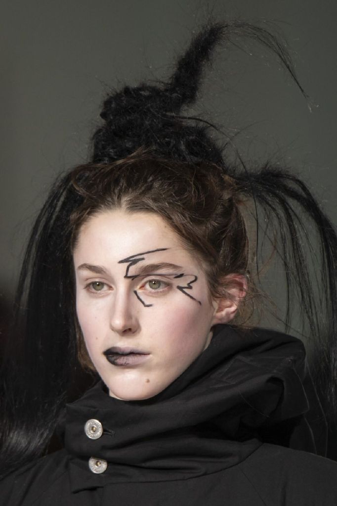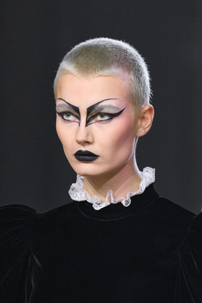 Now, what truly steals the spotlight is the makeup. It’s an artful symphony of shadows, shapes, and colors, designed to draw you into its enigmatic embrace. James Kaliardos, the maestro behind this makeup masterpiece, employed tape and a deft eyebrow pencil to create those bold, evocative shapes that graced the models’ visages. But it didn’t stop there. NARS Climax liquid eyeliner took center stage, painting these daring designs with intense, rich hues that seemed to dance on the skin. The graphic eyeliner, striking in its stark precision, collided with a choice of matte black or mysterious blue lipstick. It was a marriage of contrasting elements, creating an allure that was both captivating and unsettling.