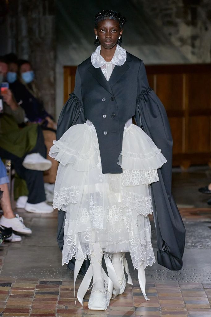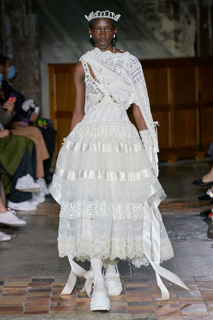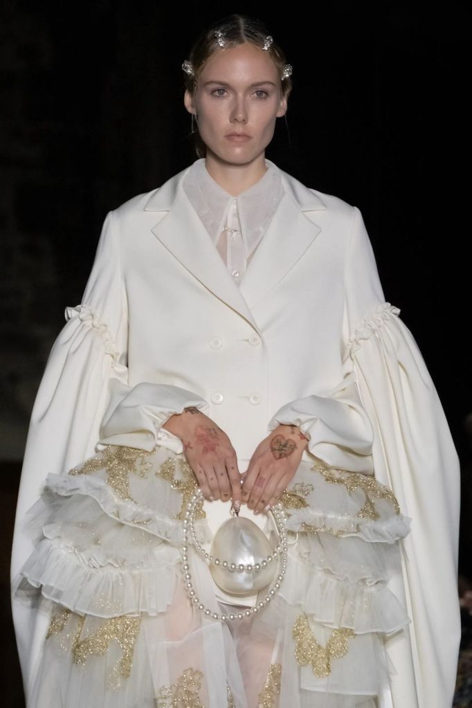 In this collection, Simone Rocha has artfully channeled the profound and transformative journey of motherhood into a celebration of femininity, combining the sacred and the luxurious to create garments that resonate with depth, emotion, and a touch of otherworldly charm.