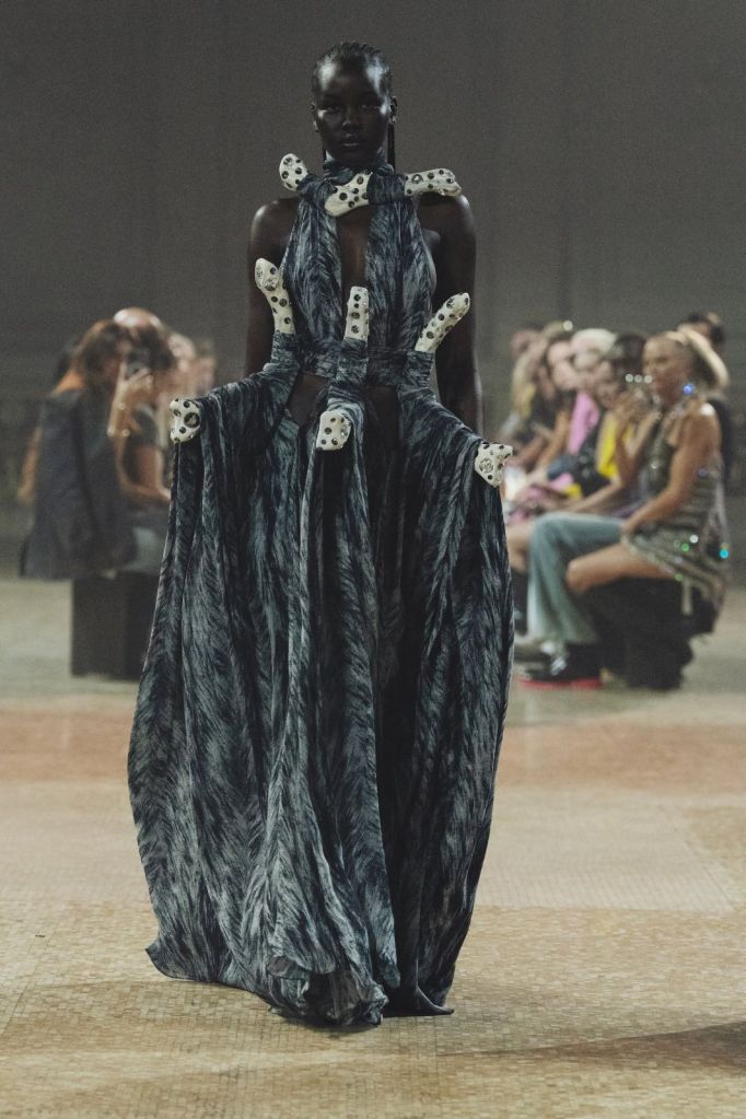 Hillary Taymour, the ingenious creative force behind Collina Strada, has orchestrated a whimsical menagerie of anthropomorphic creatures that’s nothing short of enchanting. Among the runway’s captivating inhabitants, you’ll discover rabbits, lizards, fawns, pigs, horses, deer, and a symphony of birds. It’s a fanciful gathering that celebrates the eccentric and the extraordinary.