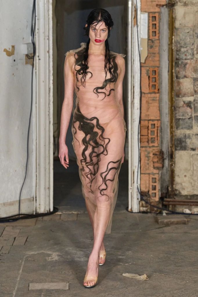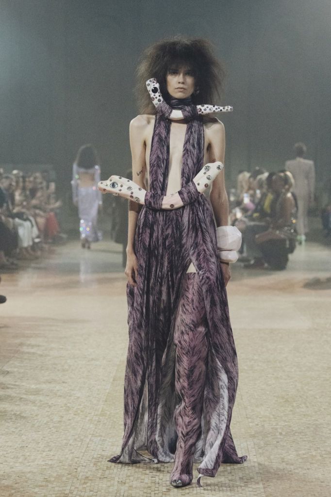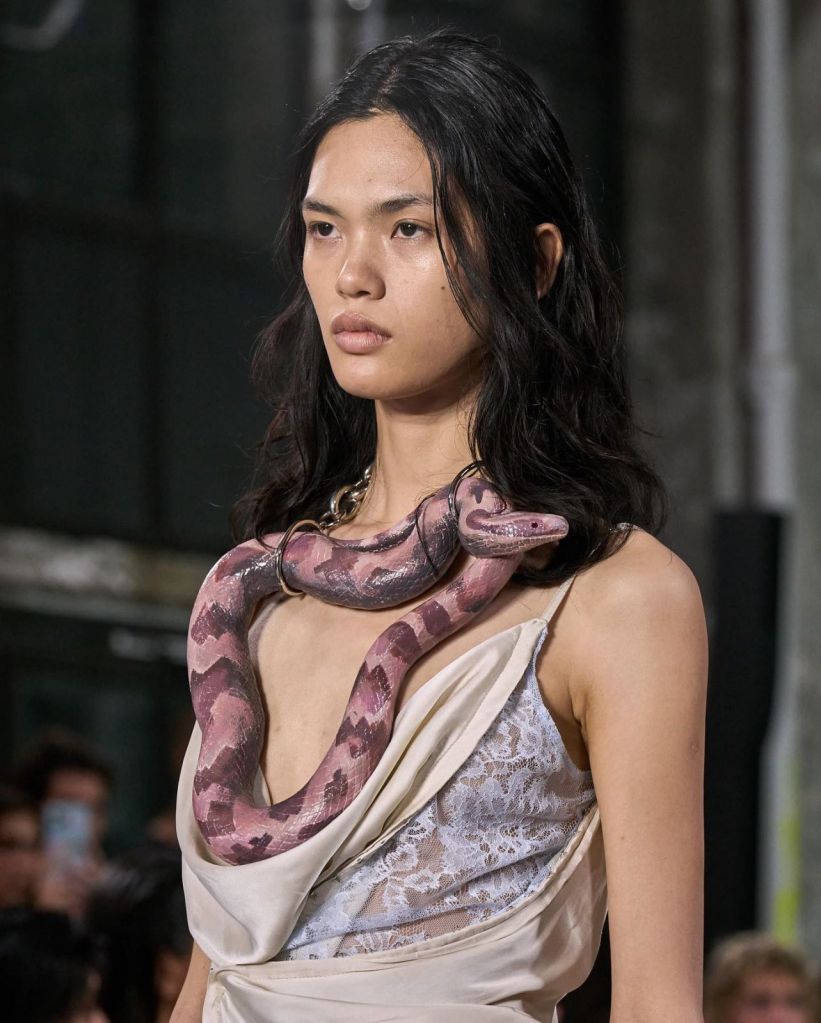 In the realm of fashion, it’s often the accessories that hold the power to truly transform a look into something extraordinary. Glenn Martens, ever the visionary, has ingeniously paired her ethereal slip dresses with a most unusual and striking choice: large snake necklaces. Rest assured, these serpents are of the faux variety, but their lifelike appearance adds a mesmerizing element that’s perfect for the Halloween season.