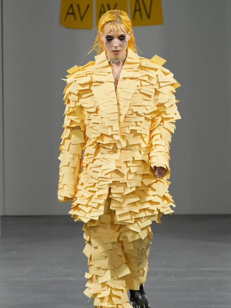 If you dare to don one of these attention-grabbing ensembles, unleash your inner artist and let your creativity flow. Pair your Post-it power suit or tape dress with bold, unconventional hair that challenges the norm. Opt for wild colors or unexpected textures – the bolder, the better. For your makeup, think beyond boundaries. Embrace the edgy allure of smudged black eye makeup, with eyeliner daringly dripping down to your cheeks. It’s a look that defies convention and beckons admirers to enter a realm of avant-garde extravagance.