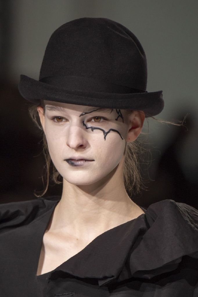 Yohji Yamamoto’s Fall/Winter 2020 collection is a mesmerizing fusion of dramatic ghostly aesthetics with elements of corsets, crinolines, and fin de siècle silhouettes, all infused with a rebellious punk spirit. The avant-garde makeup, adorned with striking graphic signs around the eyes and selectively applied black lipstick, offers a hauntingly perfect transformation for Halloween, creating an eerie yet captivating ensemble that beautifully captures the essence of this unique fashion season.