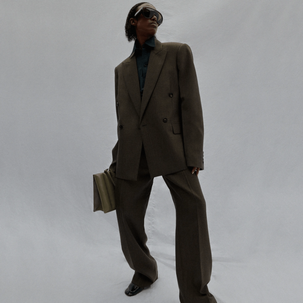 The brand seamlessly blurs gender boundaries, exemplified by a classically tailored double-breasted coat originally designed for women but meticulously crafted to embrace men’s measurements, evoking the delightful nonchalance when women don an oversized men’s coat. Every fold and crease is carefully considered, akin to the pleats in a pair of trousers, transforming the arm into a sharp-lined work of art.