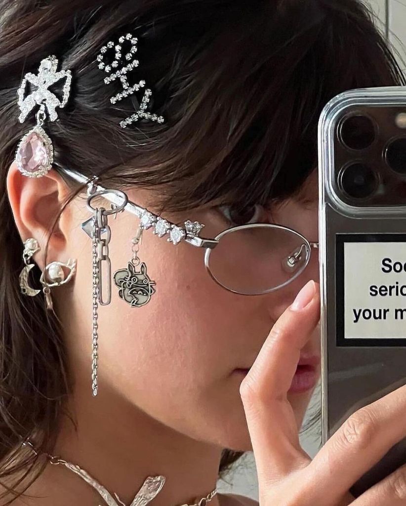 The Pierced 02 Gentle Monster x D’Heygere glasses diverge from the once-trendy hipster glasses of 2013, with their thick black-rimmed aesthetic that often sported a lens-less style during the era of Starbucks and the omnipresent Keep Calm graphics. These modern glasses transcend time, conjuring an air of an imagined past while infusing a contemporary flair with ornate inserts that transform them into jewelry rather than merely functional eyewear. Crafted with a silver metal frame of elegant oval design, these glasses take on a seemingly straightforward appearance, yet their allure skyrockets with detachable piercings adorned with delicate diamonds. The amalgamation of classic nerdy chic and the whimsical freedom of customization gives birth to a product that seamlessly blends two quintessential themes of 2023: nostalgia and individuality.